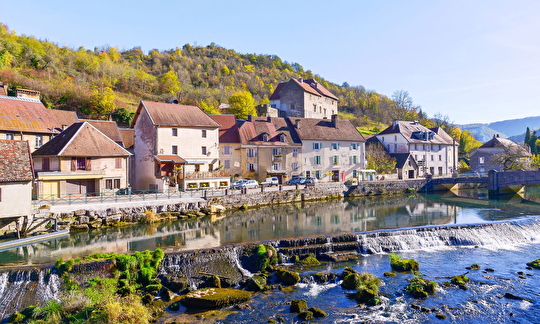 Blotti autour de son église à flanc de colline, le petit village de Lods dégage un charme enchanteur : ruelles bordées de belles maisons vigneronnes, petits ponts enjambant la Loue, rivière cascadante...