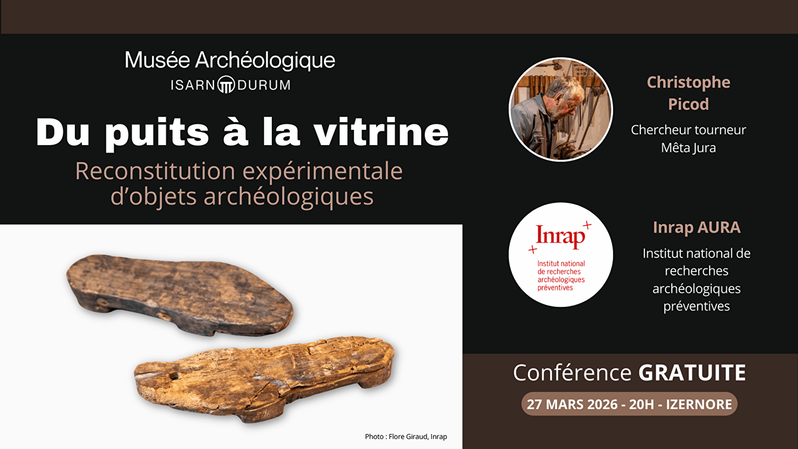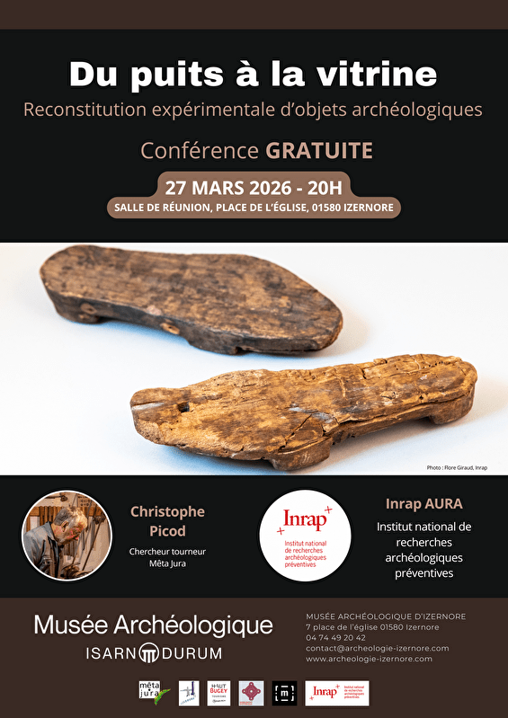 Dans le cadre de l’exposition temporaire « Puits de Savoirs : 240 ans de fouilles à Izernore », le musée archéologique d’Izernore propose une conférence gratuite le vendredi 27 mars 2026 à 20h, consacrée aux objets en bois antiques et à leur fabrication. Cette soirée réunira un duo complémentaire et dynamique : • Inrap AURA (Institut national de recherches archéologiques préventives) • Christophe Picod, chercheur et tourneur, association Mêta Jura Lors des fouilles archéologiques de la rue des Trablettes à Izernore, des puits encore en eau ont livrés d’exceptionnels objets en bois. L’Inrap les mis au jour et étudiés, apportant un éclairage scientifique précieux. Christophe Picod a, quant à lui, apporté son expérience en expérimentant les gestes et les outils pour recréer les objets présentés dans l’exposition temporaire. Ce dialogue entre science et savoir-faire artisanaux permet de mieux comprendre les techniques antiques, leurs contraintes et leur ingéniosité. Une conférence accessible à tous, pour découvrir comment l’archéologie et l’expérimentation se complètent pour faire revivre les objets du passé.