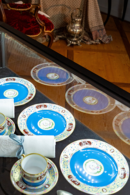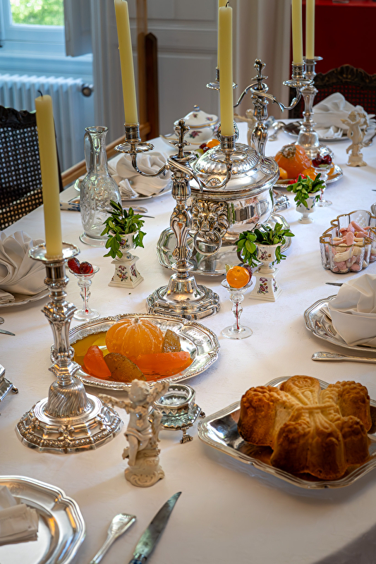L’exposition présentera neuf tables symbolisant les voyages et séjours du philosophe chez ses amis. La découverte débutera avec la première table dressée au Grand Couvert : elle permettra de mettre en avant le service à la française. Le voyage continuera avec « Voltaire chez Frédéric II » où sera évoqué son séjour en Prusse entre 1740 et 1744 et les fastes de la cour de Sans-Souci ; vient ensuite la table d’Emilie du Châtelet illustrant les 12 ans de vie quasi-commune entre les deux amants. « Voltaire en Lorraine » permettra de découvrir les jeudis de Stanislas où les discussions philosophiques et littéraires étaient mises à l’honneur ; deux autres tables évoqueront les réceptions qu’organisaient Voltaire et Madame Denis à Ferney tandis que la sixième sera celle des paysans de Ferney illustrant la coutume de Voltaire d’offrir des diners pour les fermiers de passage. Les deux dernières évoqueront le rituel de l’heure du thé en Angleterre où Voltaire séjourna 3 ans et une reconstitution imaginaire de ce rituel à la Cour de Catherine II de Russie.