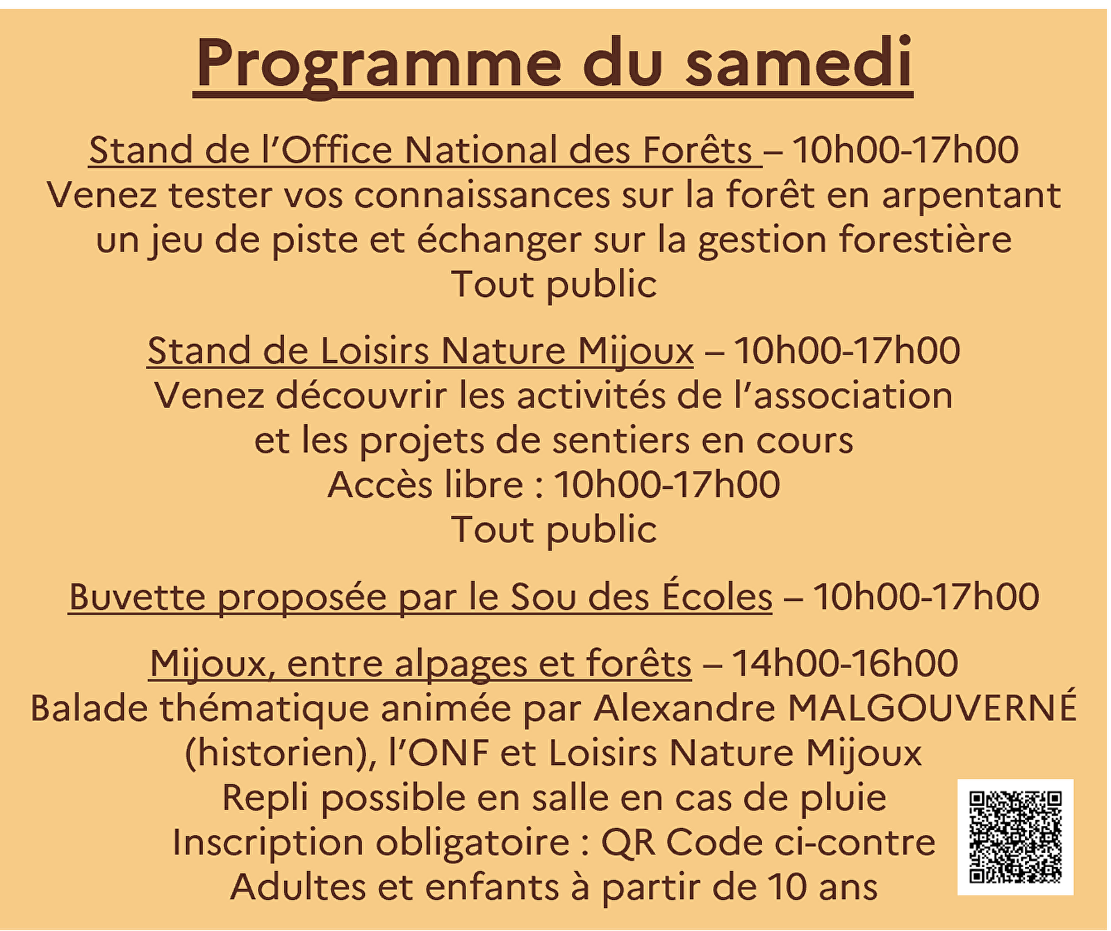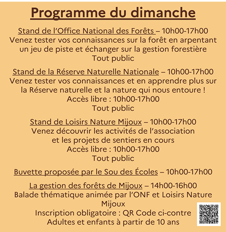 A l’occasion de la Journée internationale des forêts, l’Office national des forêts organise des événements gratuits et pour tous publics en France du 18 au 29 mars 2025. À Mijoux, le public est invité à venir se ressourcer et participer à des jeux de pistes et visites en forêt. • Stand de l'Office National des Forêts : venez tester vos connaissances sur la forêt en arpentant un jeu de piste et échanger sur la gestion forestière • Stand de Loisirs Nature Mijoux : venez découvrir les activités de l'association et les projets de sentiers en cours • Buvette proposée par le Sou des Écoles le samedi : "Mijoux entre alpages et forêts" - balade thématique de 14h00 à 16h00 animée par Alexandre MALGOUVERNÉ (historien), l'ONF et Loisirs Nature Mijoux. Vous découvrirez l'histoire riche de la vallée de la Valserine et l'influence de l'homme sur ses espaces depuis le Moyen Age. Adultes et enfants à partir de 10 ans. En cas de pluie, une solution de replis avec une présentation en salle sera proposée. le dimanche : • Stand de la RNN de la Haute Chaîne du Jura (10h00-17h00) : venez tester vos connaissances et en apprendre plus sur la Réserve naturelle et la nature qui nous entoure ! • "La gestion des forêts de Mijoux" - balade thématique de 14h00 à 16h00 animée par l'ONF et Loisirs Nature Mijoux. Vous découvrirez les enjeux de la gestion forestière et mes effets du changement climatique sur nos forêts. Vous apprendrez également comment l'association s'efforce de faire revivre de vieux sentiers autrefois utilisés par les Mijolands. Adultes et enfants à partir de 10 ans.