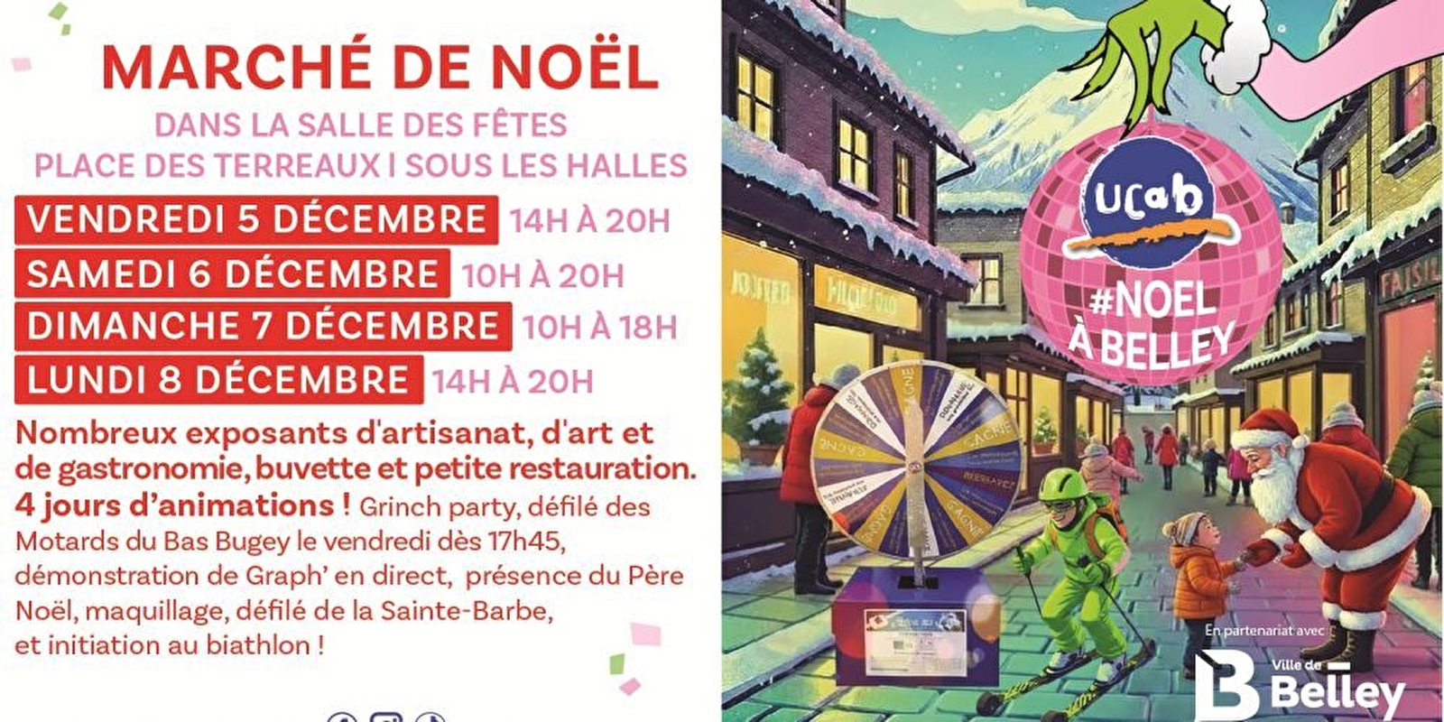 Créateurs d'art, bijoux, décoration, vins, confiserie, gâteaux, couture, carterie...de nombreux exposants vous accueillent pour commencer vos emplettes de Noël ! Profitez également de toutes les autres animations : -Initiation biathlon -Maquillage enfants -Présence du Père Noël -Musique et animation du 8 décembre, à découvrir sur notre site ! -Grinch party -Défilé des Motards du Bas Bugey le vendredi dès 17h45, -Démonstration de Graph' en direct -Défilé de la Sainte-Barbe Durant le marché, savourez le meilleur vin chaud du Bugey à la buvette de l'UCAB et de la petite restauration proposée, salé et sucré.
