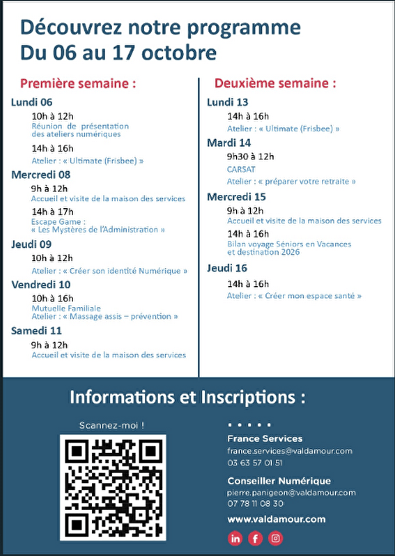 N'oubliez pas de vous inscrire par téléphone au 03 63 57 01 51 ou par mail à france.services@valdamour.com