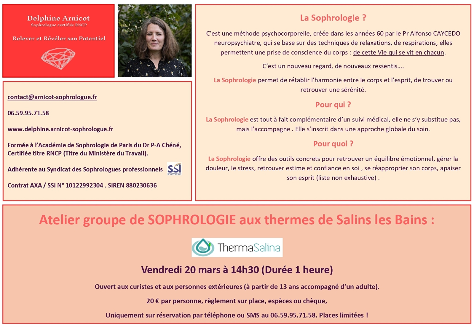 Atelier dispensé par Delphine Arnicot, formée à l'Académie de Sophrologie de Paris. Certifiée RNCP (Ministère du travail).