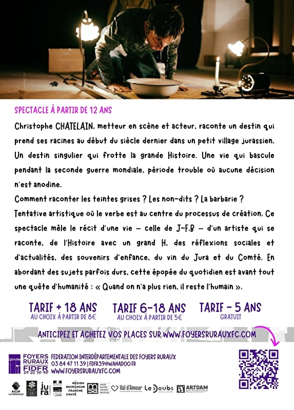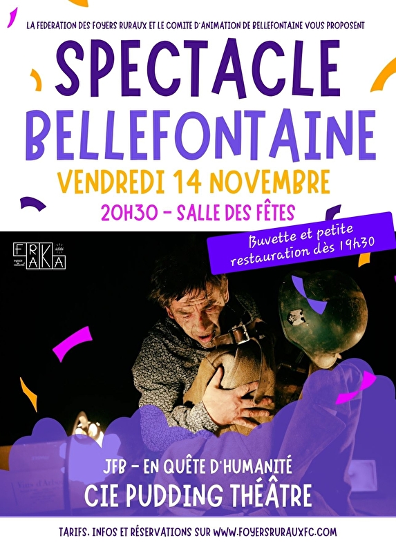 La Fédération des Foyers Ruraux et le Comité d'Animation de Bellefontaine vous proposent d'assister au spectacle "JFB, En quête d'humanité" joué par la compagnie Pudding Théâtre.