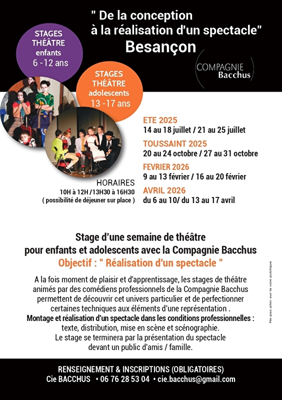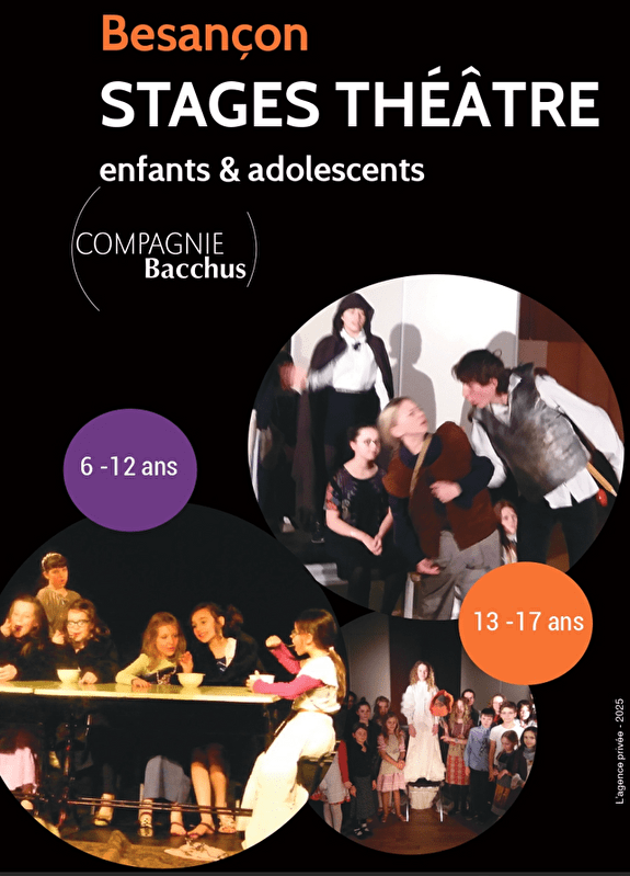 A la fois moment de plaisir et d'apprentissage, les stages de théâtre animés par des comédiens professionnels de la Compagnie Bacchus permettent de découvrir cet univers particulier et de perfectionner certaines techniques aux éléments d'une représentation . Spectacle en fin de stage devant un public, dans les conditions professionnelles, texte , distribution, mise en scène et scénographie.