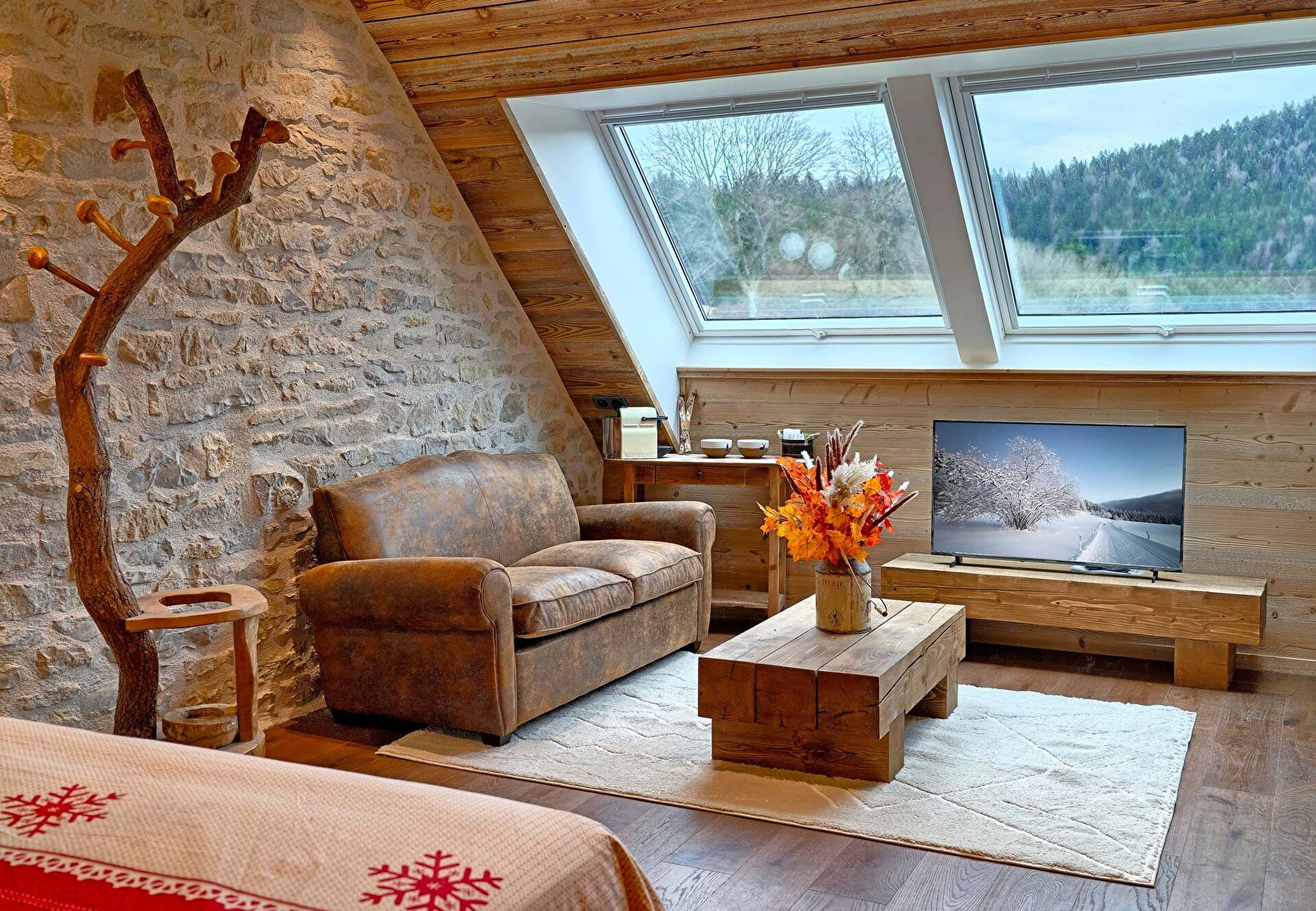 Chambres d'hôtes spacieuses,35m2/Chambre, lit King size, matelas haut de gamme, matériaux nobles (pierre et bois), une salle de bain douillette avec ses petits conforts, une salle d'accueil chaleureuse avec ses petits coins salons et la mise à disposition de machine à café et théière dans chaque chambre ainsi que dans le salon.