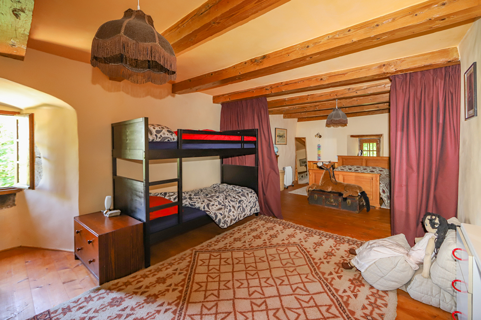 - Le Dortoir avec ses quatre lits superposés plus un lit double (140cm) derrière des rideaux.