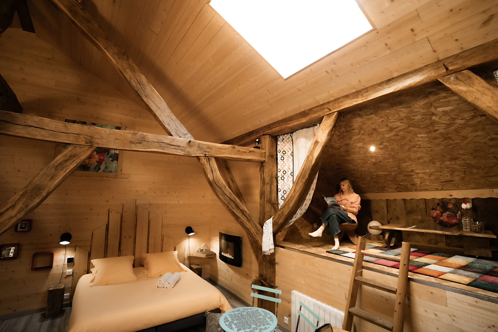 C'est dans la grange que les chambres Séquoia, Agathis et Epinette vous apportent tout le confort attendu sous une charpente centenaire en chêne.