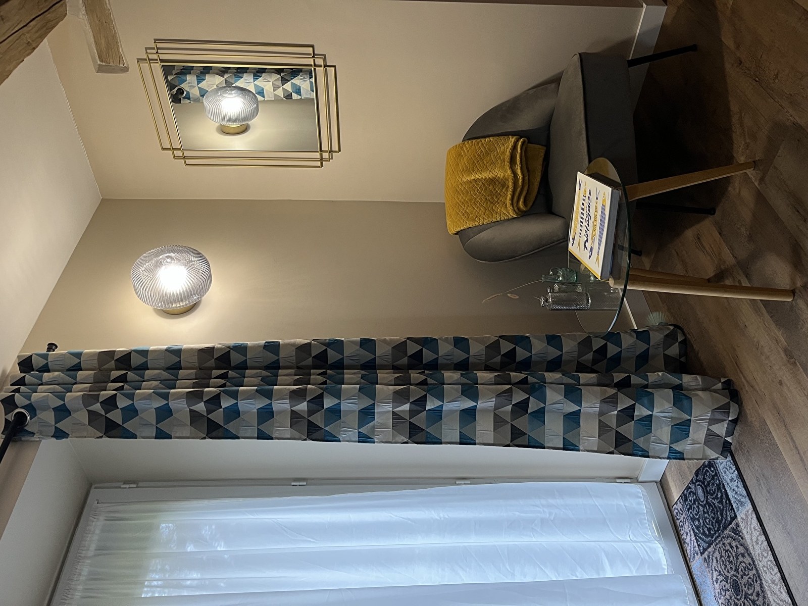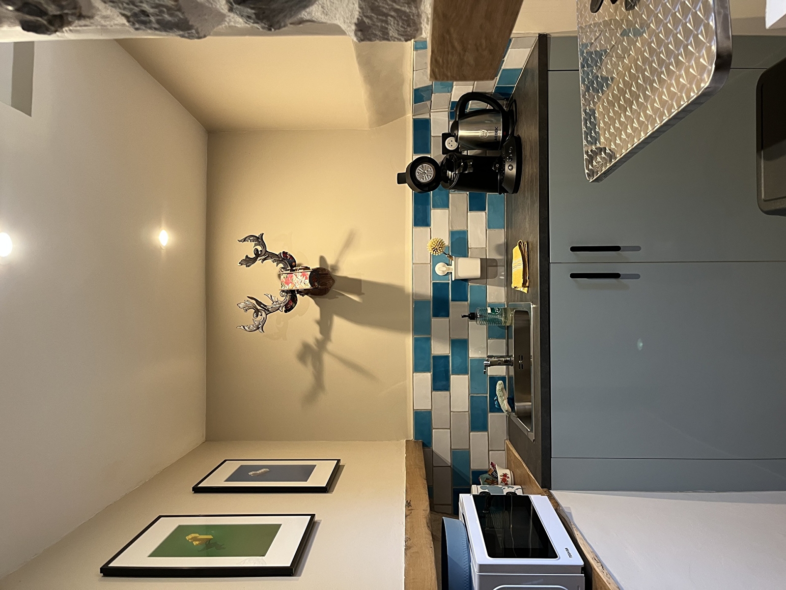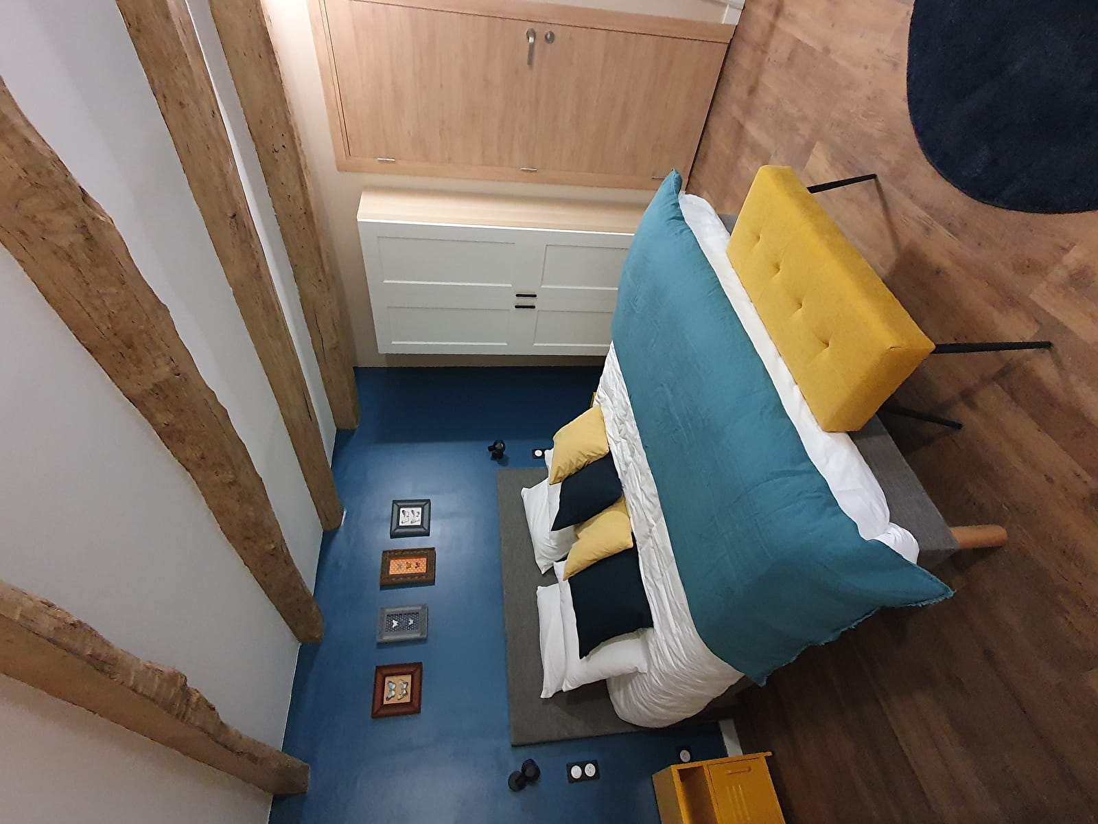 La chambre Indigo reflète l'esprit de l'établissement Le Terrier : un mélange de caractère et de finitions soignées. Les propriétaires ont pensé chaque détail de l'aménagement, privilégiant des matériaux nobles et des textures qui invitent au repos.