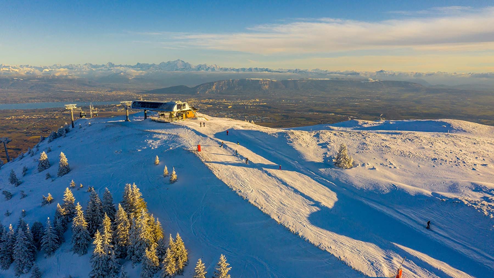 Au sommet, le Mont Blanc et toute la chaîne des Alpes suisses et françaises, le lac Léman et la ville de Genève dévoilent au loin leurs contours enneigés. L’un des panoramas les plus spectaculaires d’Europe !