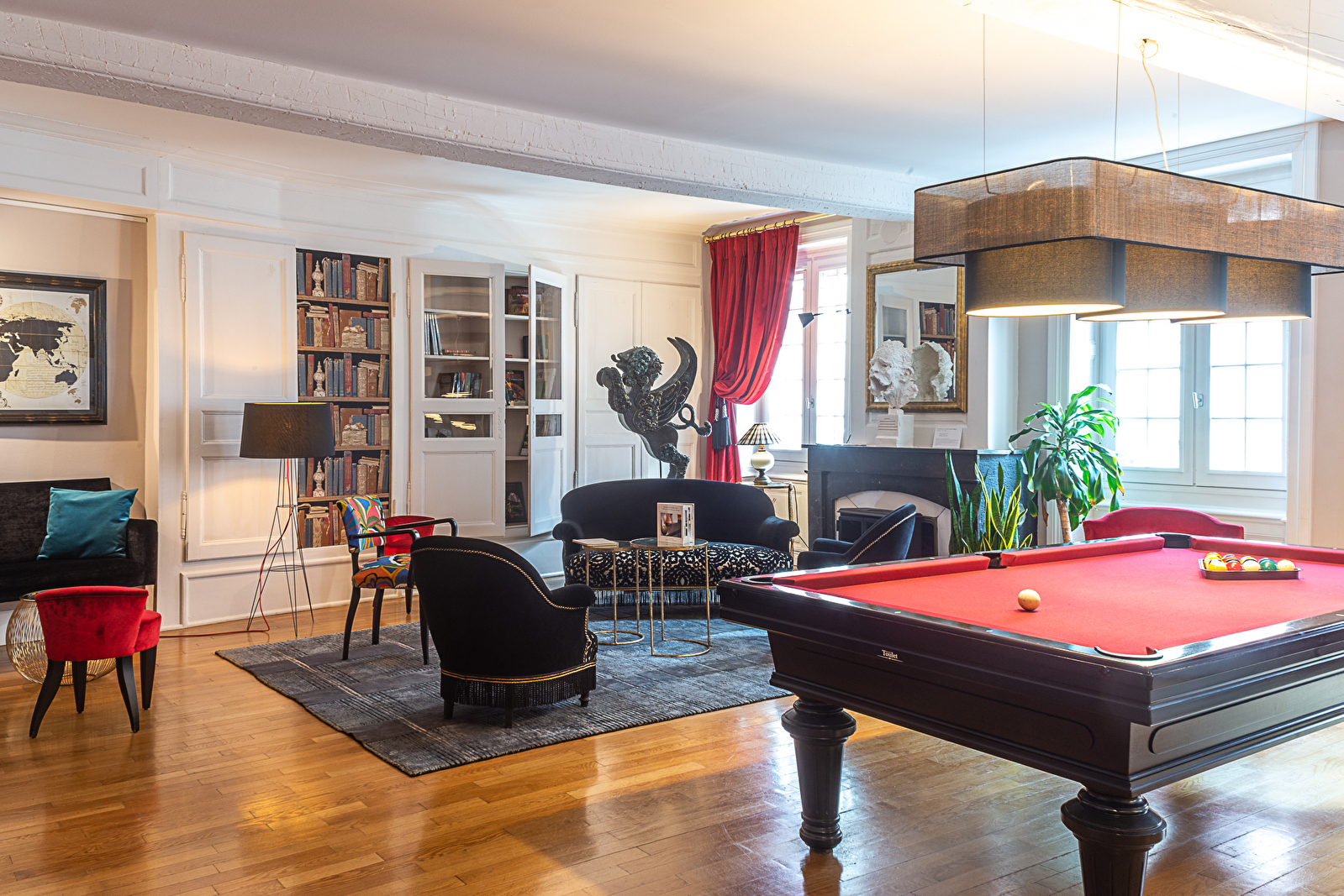 Univers soigné des 16 chambres aux ambiances toutes différentes et ses beaux espaces communs : salon détente avec billard, bar et terrasse dans la cour intérieure.