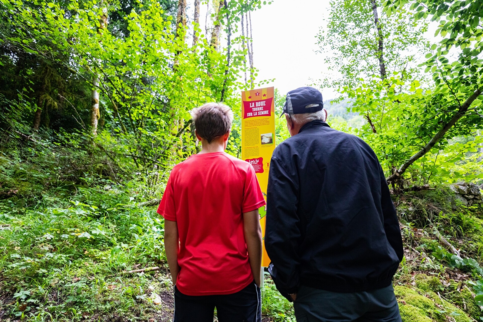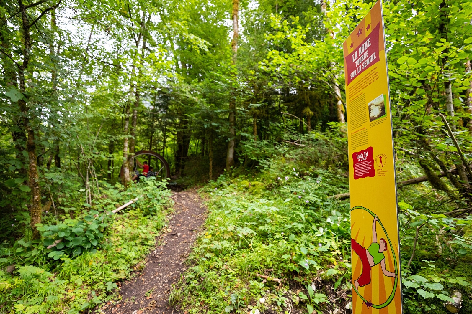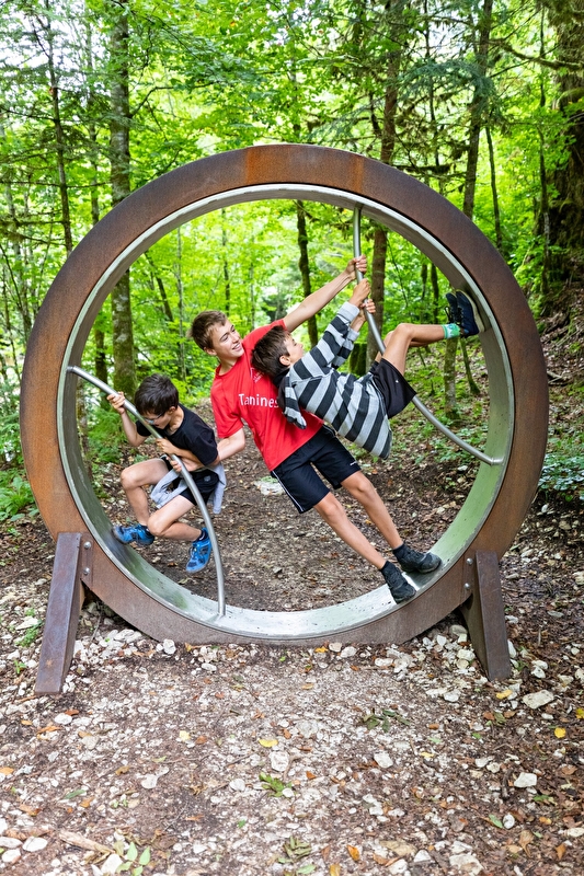 Entre sous-bois et vastes prairies, vous découvrez un paysage verdoyant typique du massif jurassien. 10 stations d'interprétation agrémentées d'un mobilier ludique donnent vie à des numéros spectaculaires : équilibristes, acrobates, dresseurs, voltigeurs ... un véritable terrain d'aventure et d'éveil pour comprendre le paysage en s'amusant.