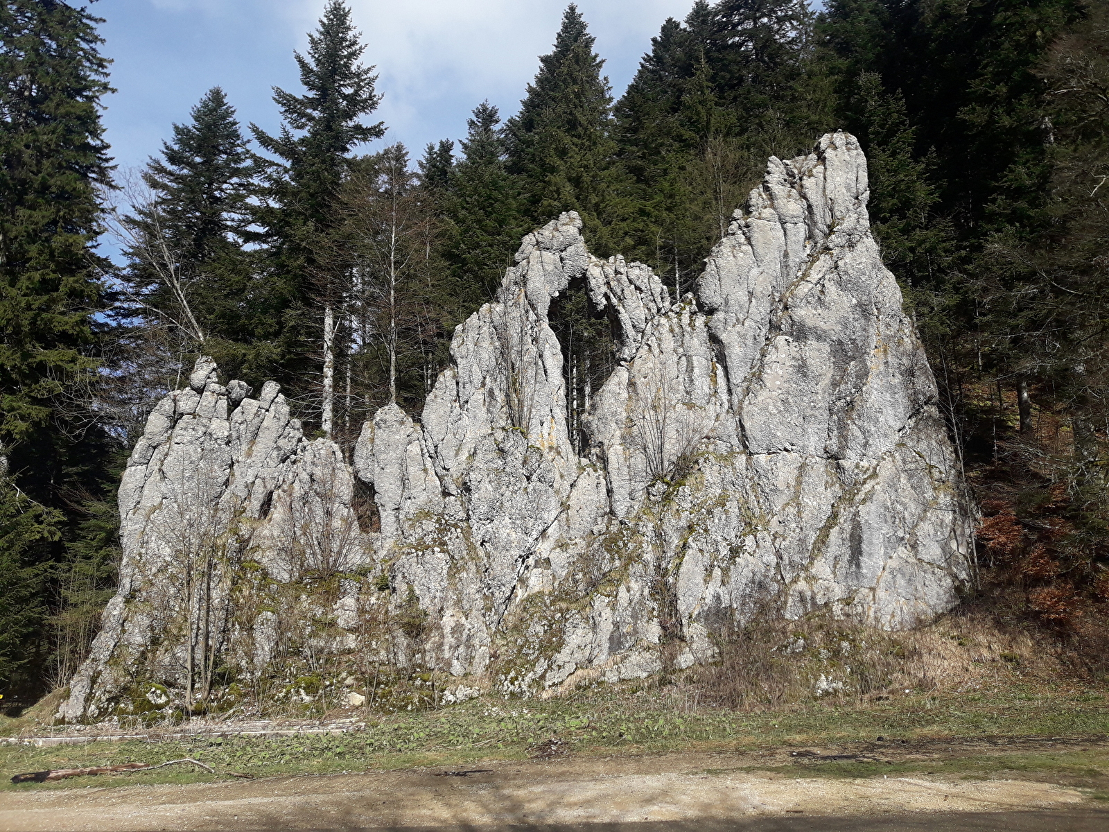 Depuis les rochers calcaires érodés, dits « des 3 Dames », engagez-vous sur le chemin empierré qui borde le ruisseau des Entreportes jusqu’à la frontière. Ce passage historique de la contrebande du sel fut obstrué par l’occupant allemand en 1940 pour interdire l’accès à la Suisse. La montée d’un petit col matérialisant le retour en France met le randonneur dans la peau du contrebandier qui, par tous les temps, regagnait les fermes isolées des Moines ou des Ouillettes avec sa marchandise.