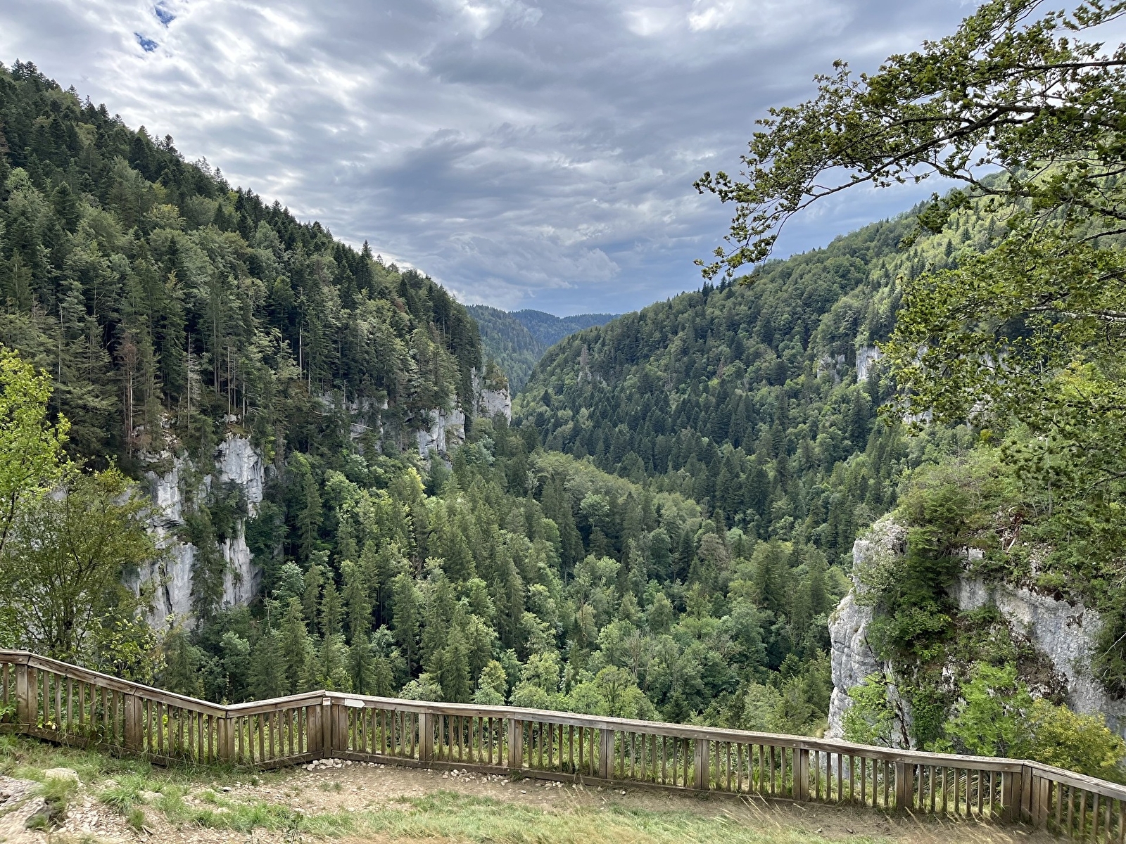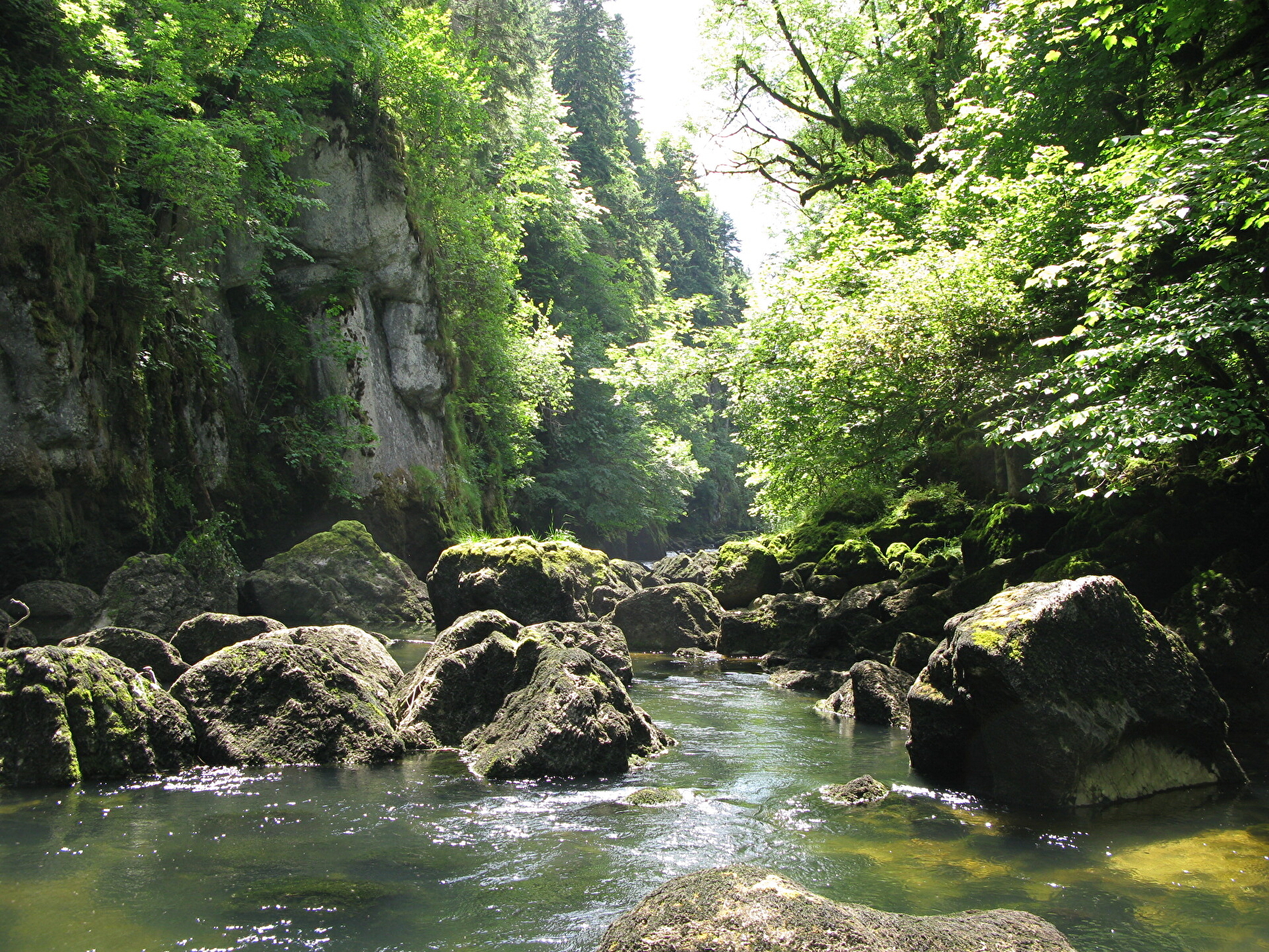 En direction de la Suisse, parcourez les sentiers forestiers, les sentes au-dessus des falaises et les couleuses jadis empruntés par les contrebandiers intrépides et les villageois en quête de produits moins onéreux.Arrivé au fond des gorges encaissées, la rivière qui forme la frontière franco-suisse, vous accompagnera de son chant particulier, autrefois complété par le bruit des scieries, des meuniers et l'appel du complice Suisse. Attention ! Les douaniers veillent. Le seul passage libre pour remonter sur le plateau est celui des Échelles de la Mort et du Bois de la Biche !