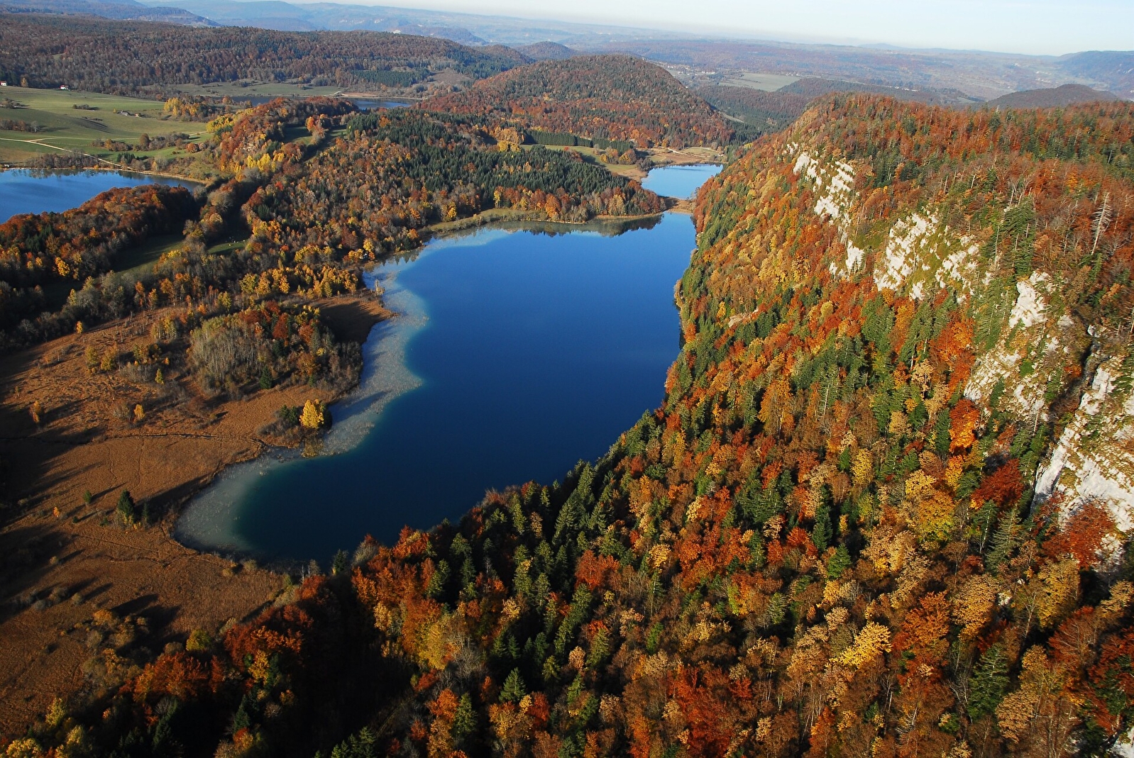 De la barre rocheuse marquant la transition entre la région des Lacs et le plateau du Grandvaux s’élèvent le pic de l’Aigle et le belvédère des Quatre Lacs, au fil d’une balade entre forêts et étendues d’eau.