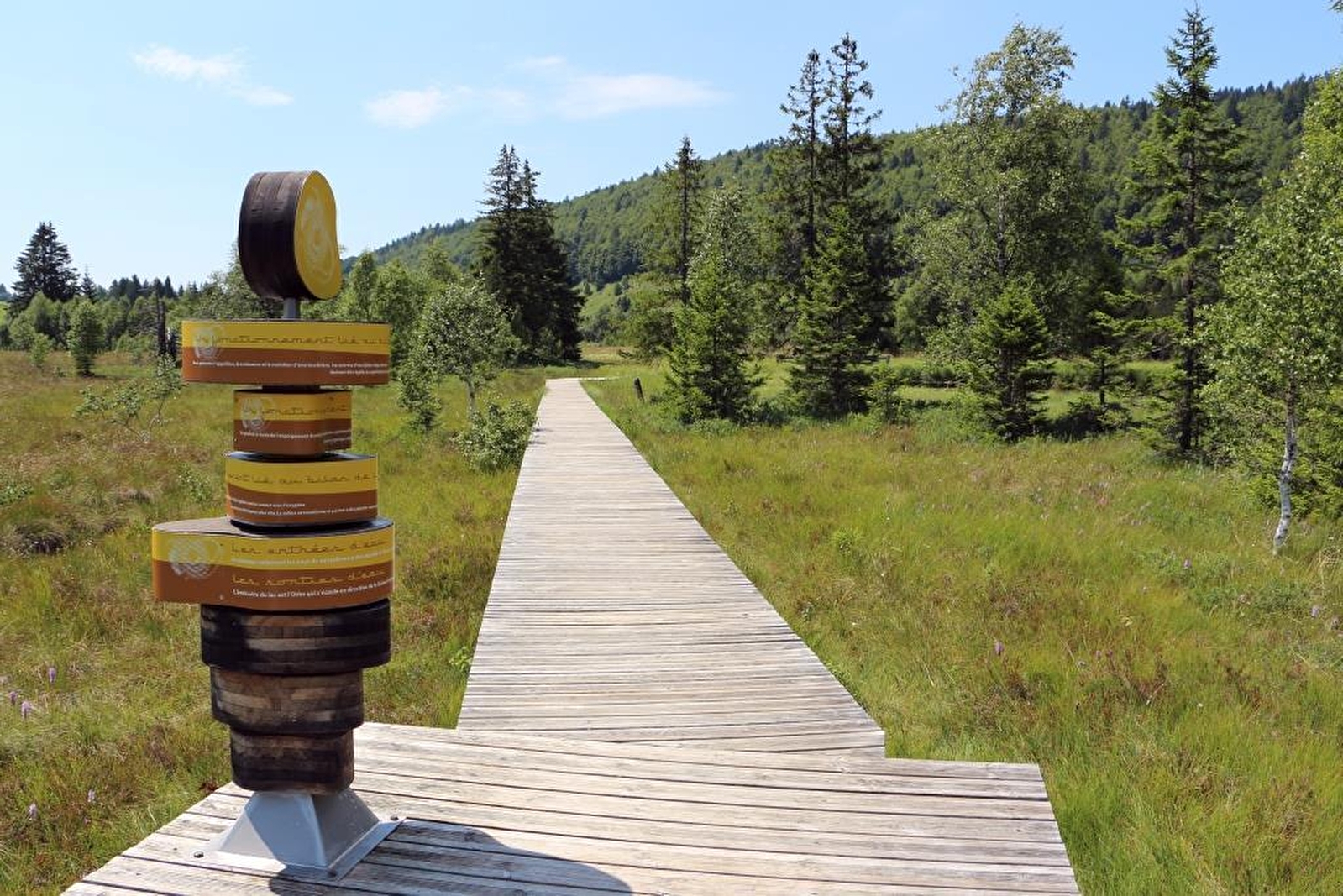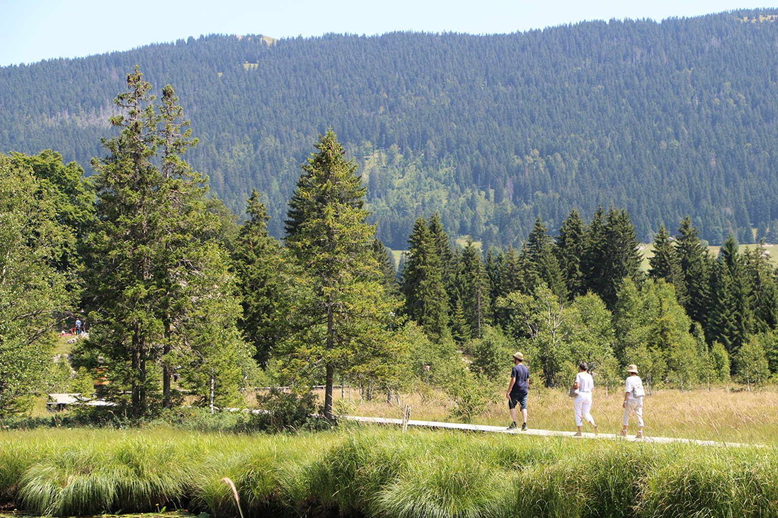 Un platelage en bois permet de découvrir la tourbière et de s'immerger dans la diversité des paysages du lac durant cette courte excursion à la portée de tous.