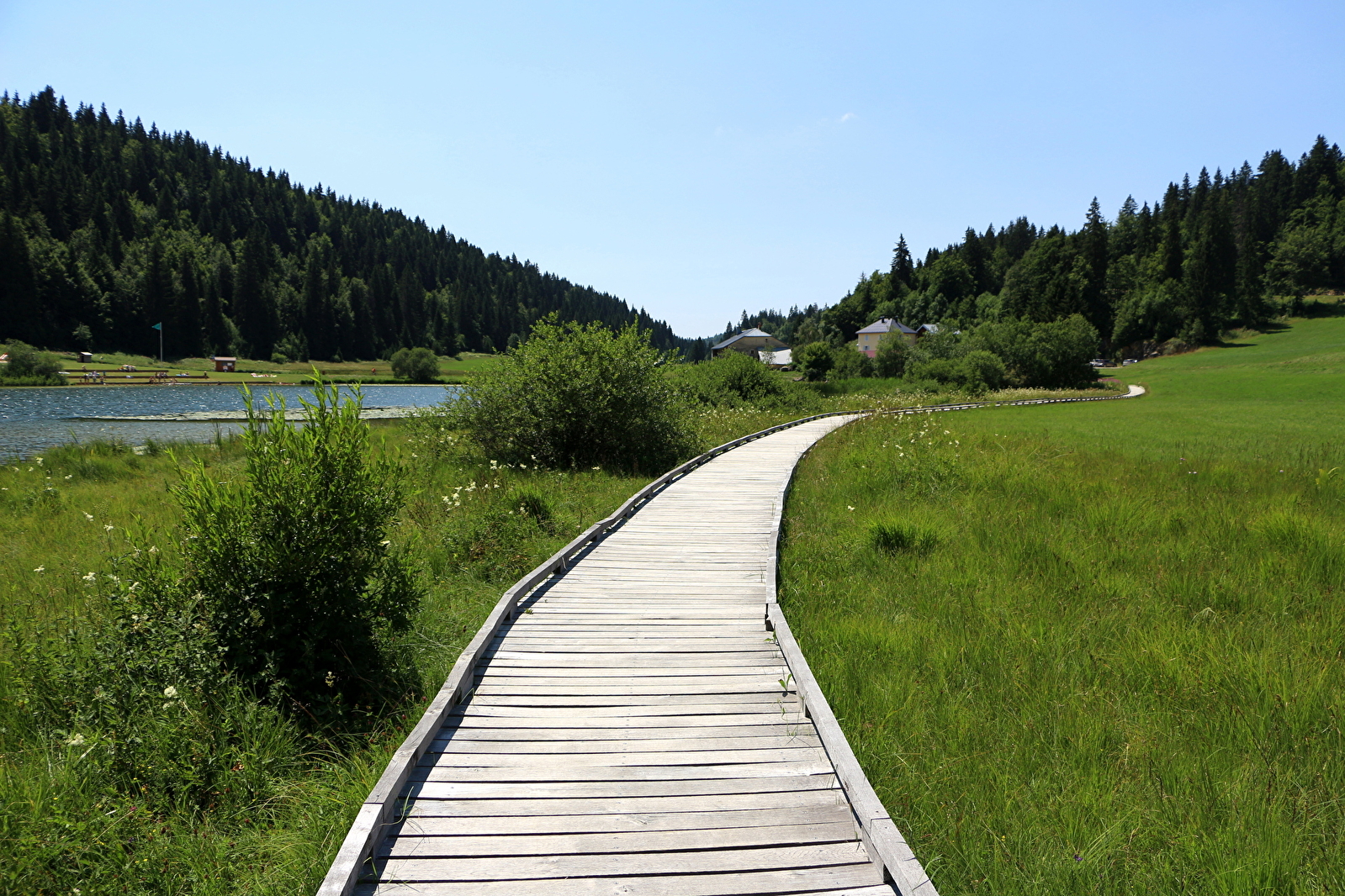 Le sentier fait le tour lac. Un platelage en bois permet de traverser les zones humides, et la tourbière sans dégrader ces milieux fragiles.