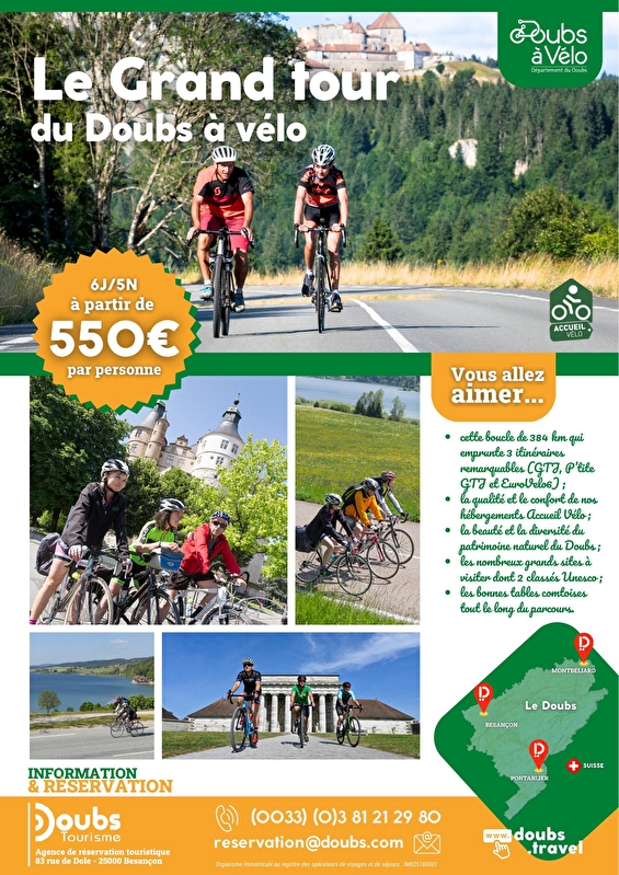 Forêt, montagnes, alpages, rivières, lacs, cités de caractère, grands espaces, sites culturels et architecture typique du territoire… En itinérance, de la ville à la campagne, vous découvrirez toute la richesse du patrimoine naturel du département duDoubs. Le Grand Tour du Doubs se décline à l'envi ! Sur 384 km et 4 000 m de dénivelé environ, il offre un condensé du Doubs : une aventure à vivre en étapes (très) sportives ou en balades, grâce notamment aux vélos à assistance électrique.Réservez vite votre séjour à partir de 550 €