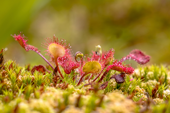 Le droséra est l’une des plantes emblématiques des tourbières autour des lacs de Bellefontaine et des Mortes. Cette petite plante carnivore, protégée, pousse dans les sols pauvres et gorgés d’eau, où elle complète ses besoins en nutriments en capturant de minuscules insectes. Sa présence témoigne de la grande richesse écologique et de la fragilité de ces milieux humides d’altitude.