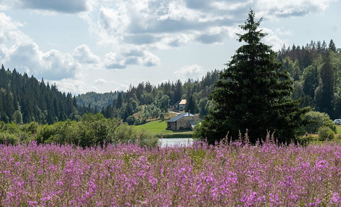 Ici, à droite, une tourbière prend place, à gauche une forêt de sapins typique du Jura... Et plus loin, à l'horizon, des prairies remplies d'orchidées sauvages.