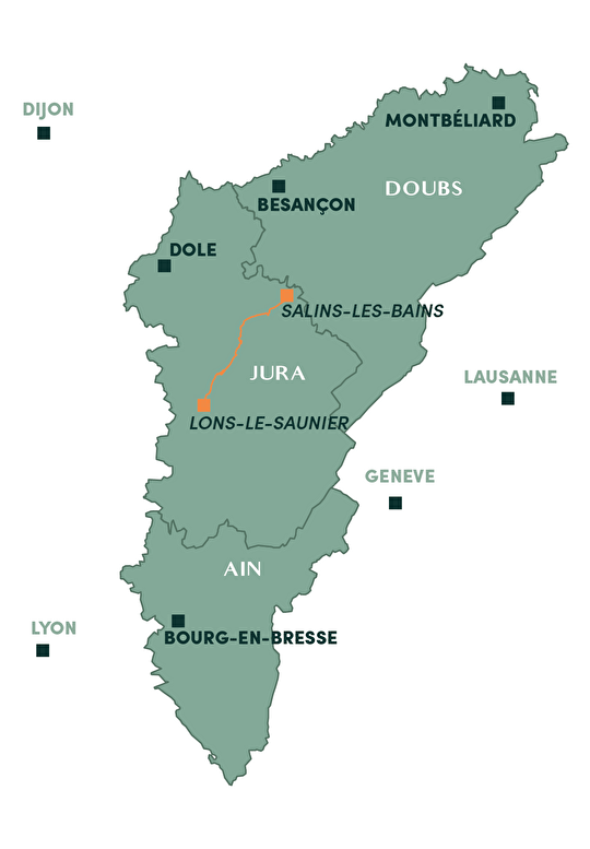 👍 Faites une halte savoureuse dans les cinq étapes qui composent ce parcours gourmand qui débute à Lons-le-Saunier et se conclue à Salins-les-Bains.
