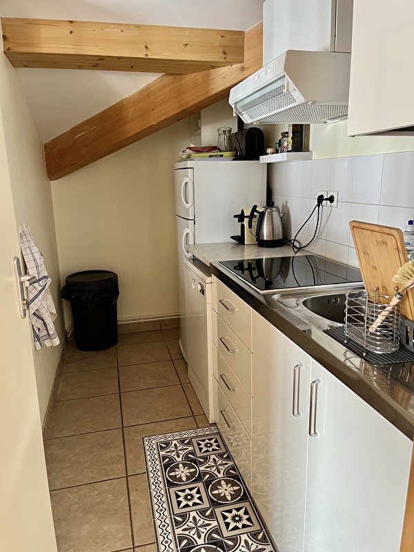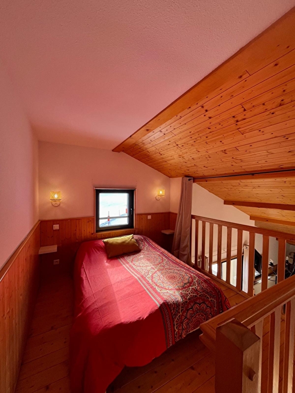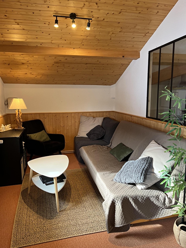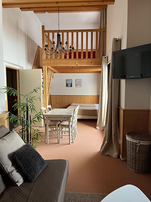 L’appartement propose un espace de vie agréable avec un salon équipé d’un canapé-lit, un coin nuit avec deux lits simples et une mezzanine accueillant un lit double.