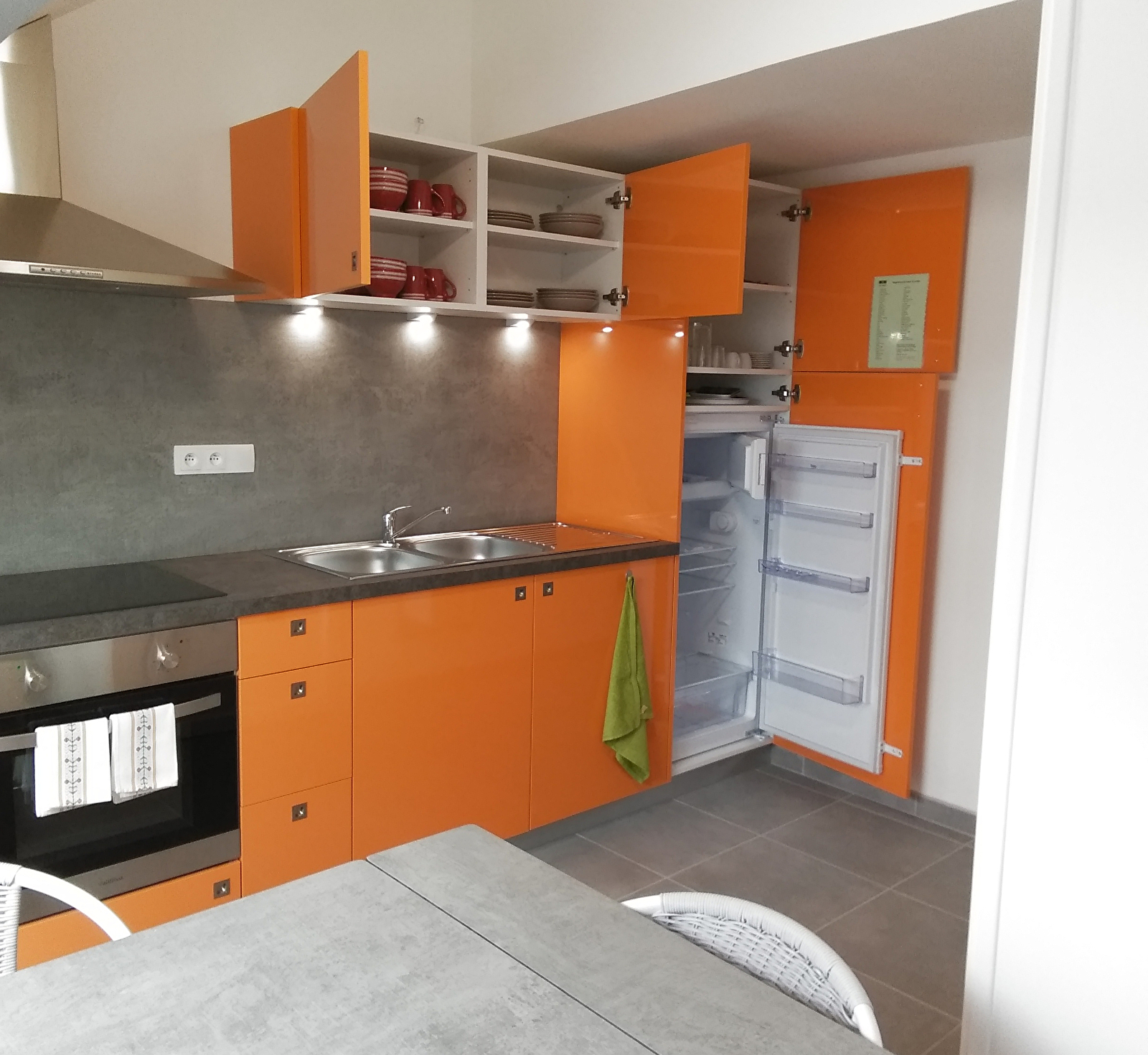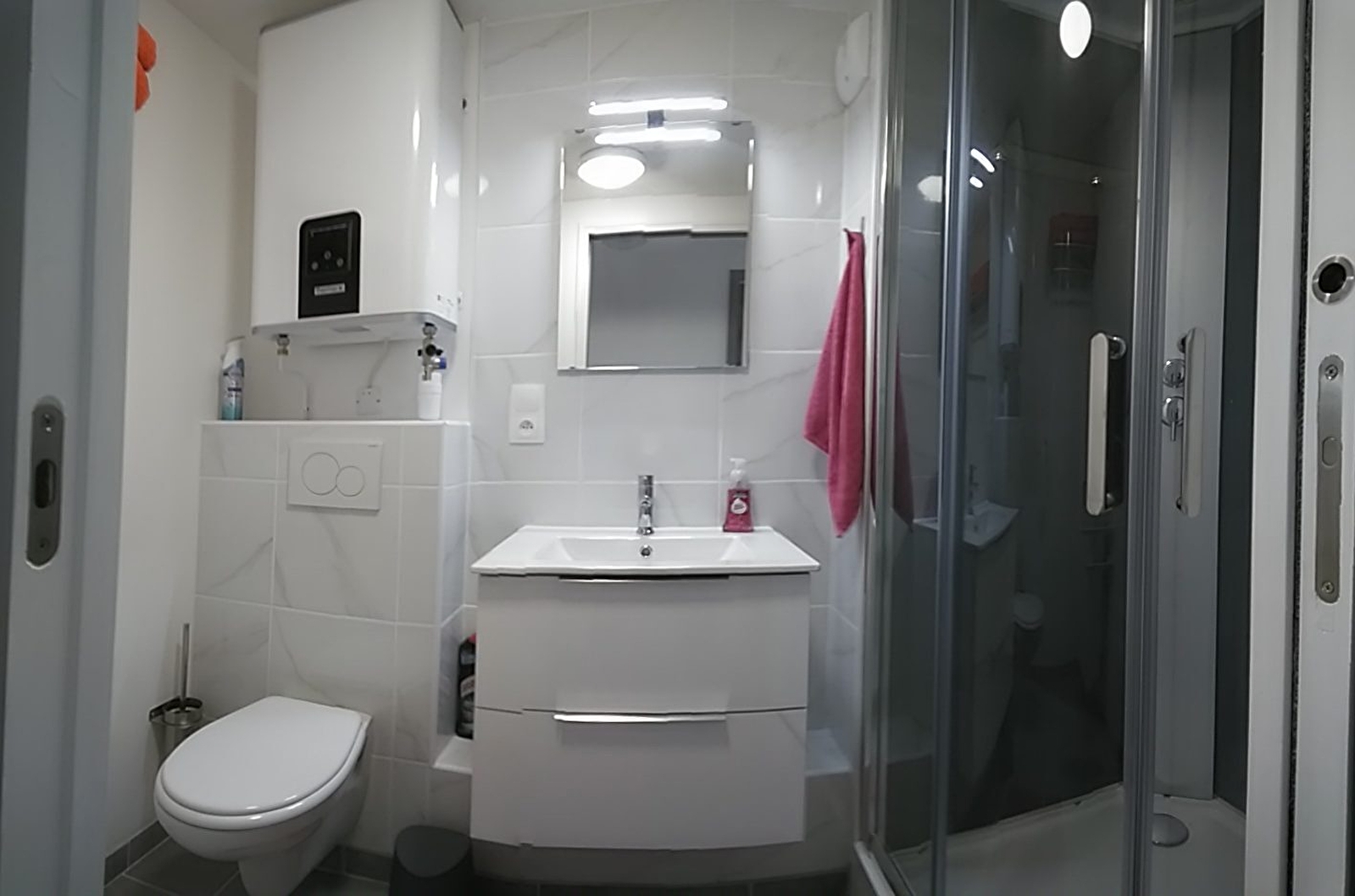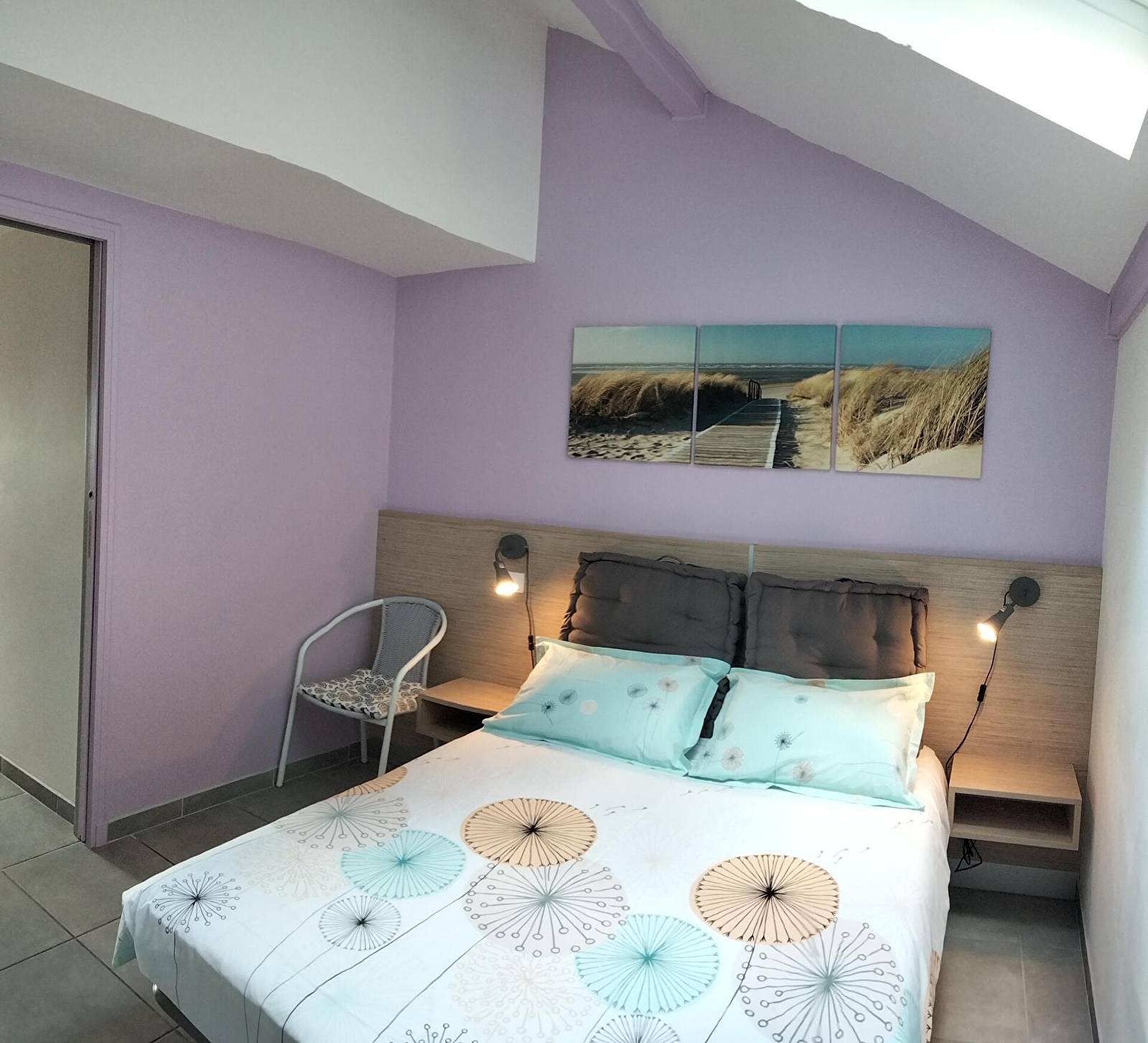 L'appartement est composé d'une cuisine équipée, d'une salle d'eau (douche, lavabo, wc) et de deux chambres (une avec un lit de 140 x 190 et l'autre avec deux lits 80 x 200). Attention, l'accès à la deuxième chambre se fait par une échelle.