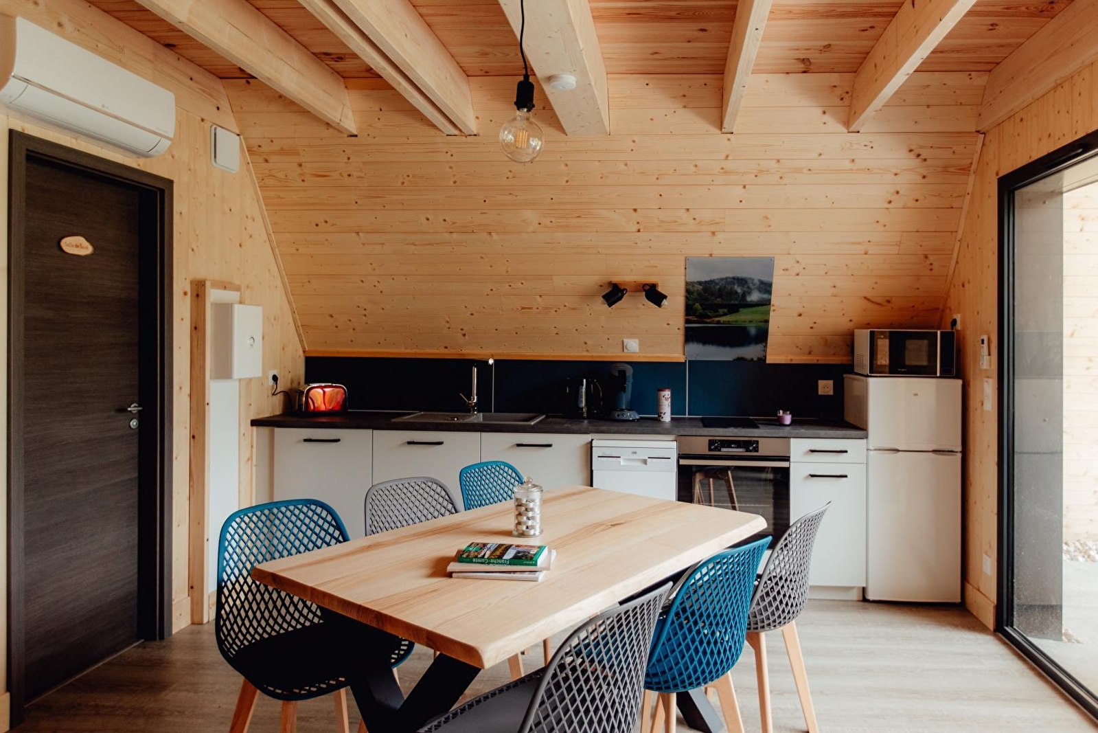 Plongez dans l'ambiance envoutante du pays des lacs du Jura en séjournant dans notre Chalet lacs, où traditions culinaires et paysages pittoresques se marient à la perfection. Son intérieur authentique, chaleureux et confortable vous invite à la détente, tandis que sa terrasse couverte vous permet de profiter pleinement du paysage environnant. Ce chalet vous offre un cadre idéal pour explorer les saveurs et les trésors du Jura.Niché au cœur du paisible village de Coyron, ce chalet atypique de 60m2 au sol (35 m² loi Carrez) vous offre une expérience unique, il se compose au rez-de-chaussée d'une pièce de vie avec coin cuisine équipée, salon avec canapé et smart TV connectée, d'une chambre avec 1 lit double (160*200), d'une salle d'eau avec douche et WC. A l'étage (accessible par un escalier un peu raide), 2 coins nuits, l'un avec 2 lits simples (90*190) et le second avec 1 lit double (140*190). Côté extérieur, vous pourrez profiter d'une grande terrasse couverte sans vis-à-vis avec salon de jardin et barbecue. Idéalement situé, à 3 mns en voiture du Lac de Vouglans, vous pourrez également visiter le musée du Jouet à Moirans en Montagne (10 mns) et pour les plus téméraires, parcourir la via ferrata du Regardoir au Pont de la Pyle (3 mns).