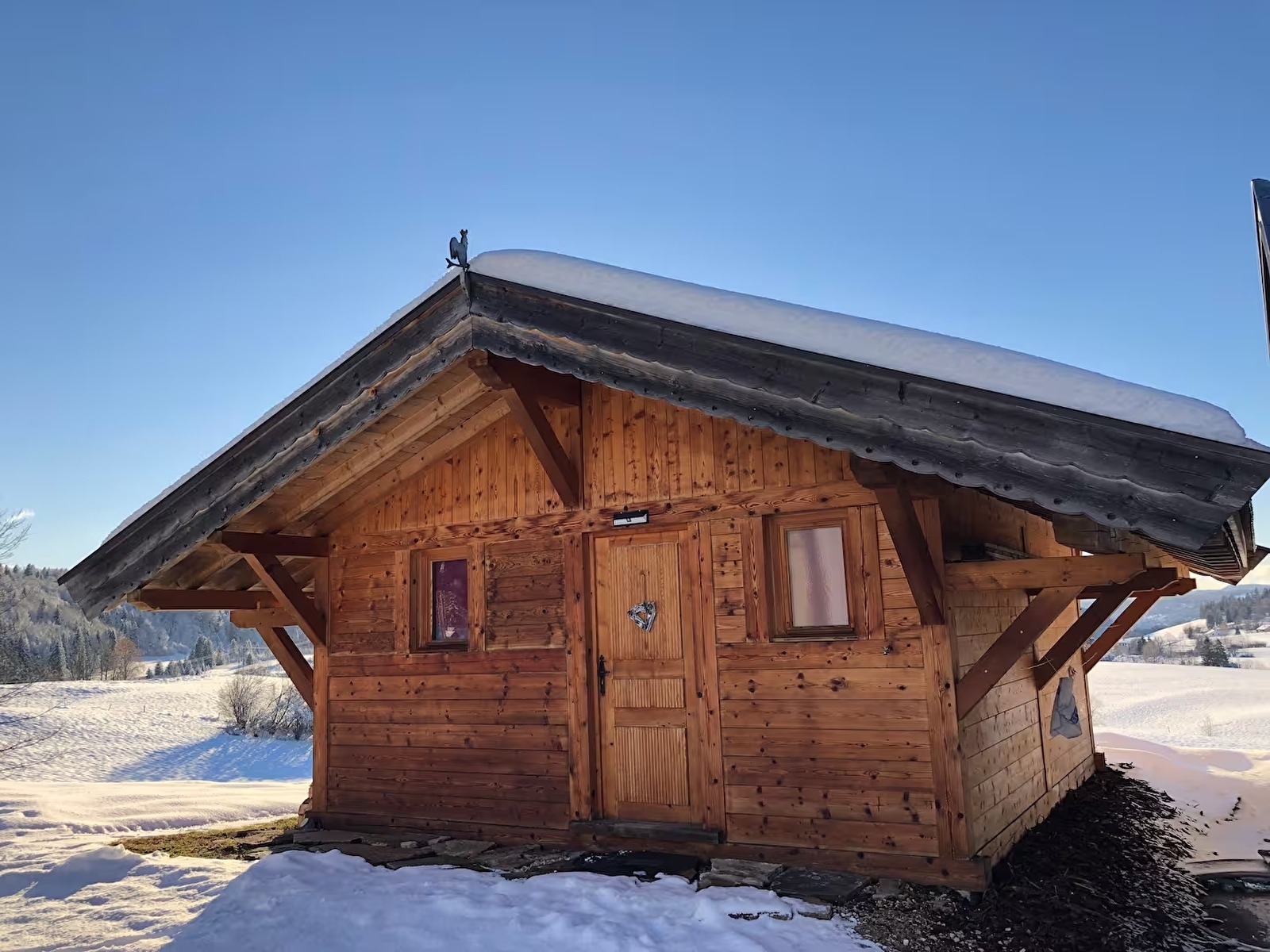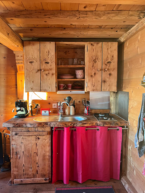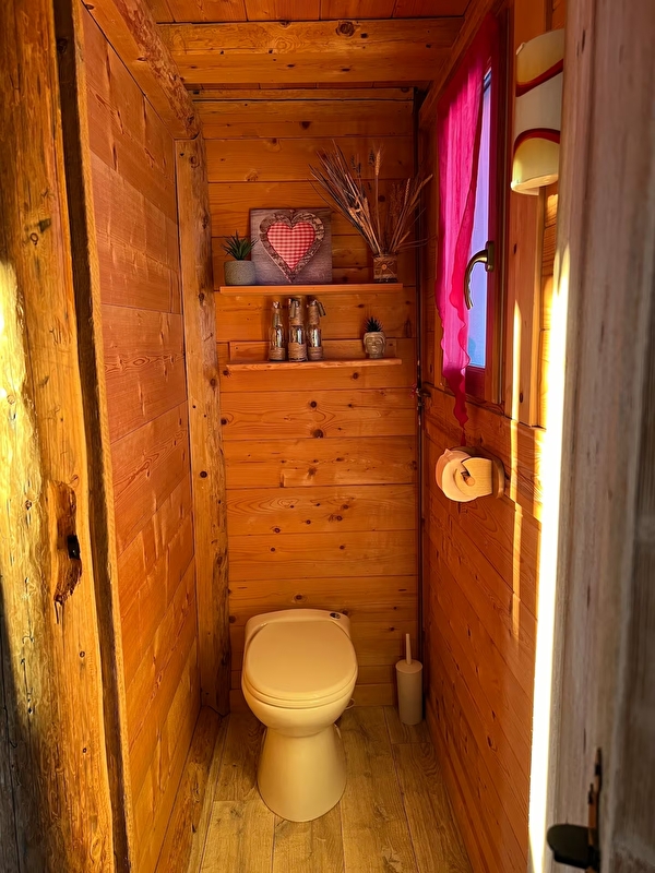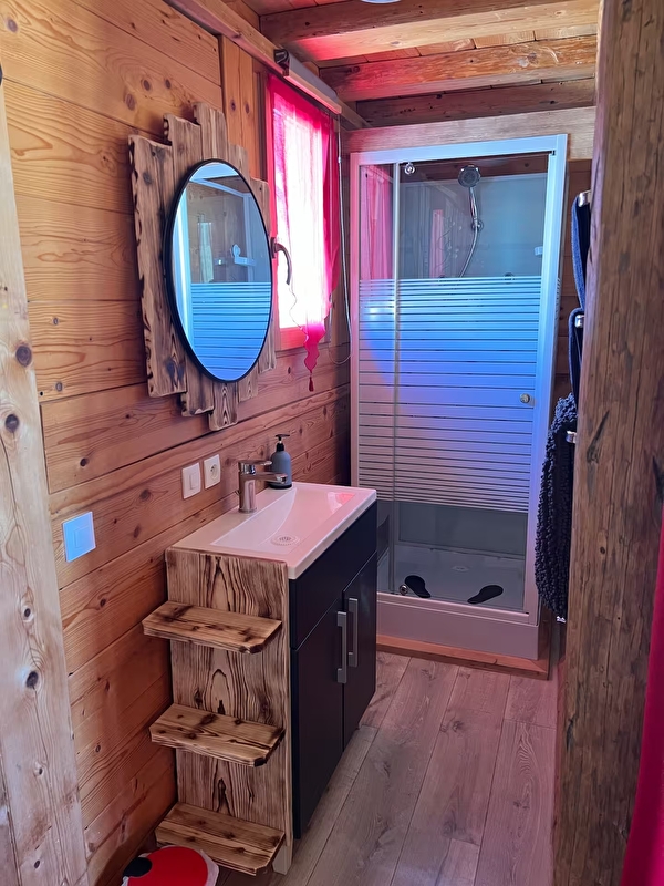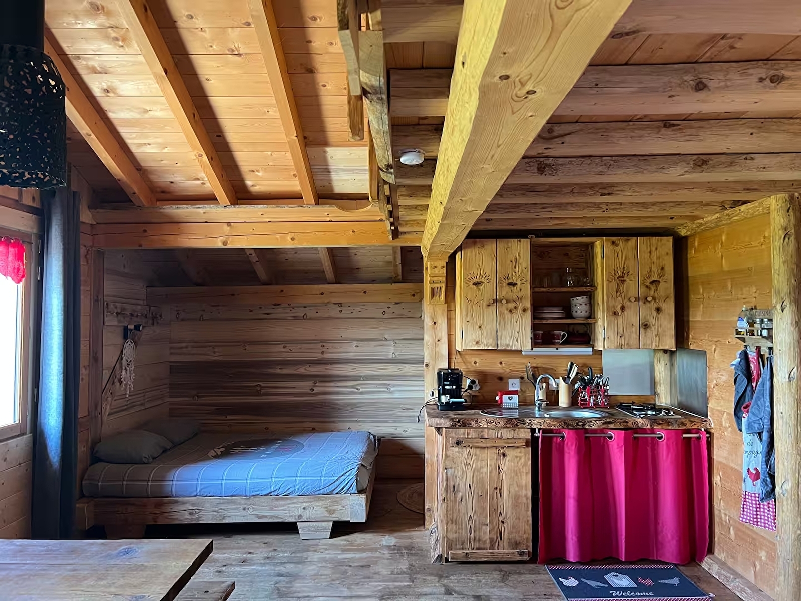 Chalet avec grande terrasse. Une pièce de 30 m2 comprenant une petite armoire, une table, un lit 140/200 ,un canapé clic-clac 2 personnes (140x200), une grande TV, un placard pour vêtements. Salle de douche et lavabo, toilettes séparées. Draps, serviettes de toilette et linge de vaisselle fournis.