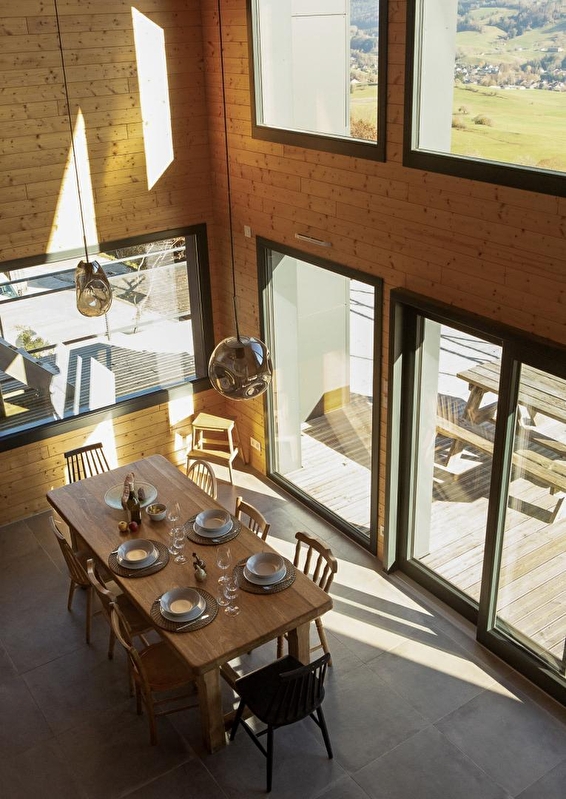 Idéalement situé sur les hauteurs de Foncine le Haut, laissez-vous séduire par ce splendide chalet totalement neuf offrant une vue imprenable sur la nature environnante. De grand confort , vous trouverez au rez-de-chaussée une vaste et lumineuse pièce à vivre composée d'une cuisine entièrement équipée et d'un salon de détente. Une première chambre équipée d'un lit de 160x200. Belle salle d'eau avec grande douche à l'italienne. Wc indépendants. Buanderie avec tout le nécessaire pour l'entretien du linge te de la maison. A l'étage, mezzanine salon avec télévision écran plat et deux chambres. La première avec un lit de 160x200cm, la seconde avec 3 lits de 90 (dont 2 lits superposés) pouvant être rapprochés pour former grâce à un sur-matelas un lit de 180x200cm. Salle d'eau avec douche à l'italienne, et wc indépendants. Une seconde mezzanine à l'étage supérieur est aménagée en chambre avec un lit de 140cm, et accessible par une échelle de meunier mais interdite aux jeunes enfants pour une question de sécurité. L'échelle peut cependant être remontée facilement pour la tranquillité des parents. Côté extérieurs, magnifique terrasse en bois équipée de salon de jardin, barbecue, chaises longues ainsi qu'un spa en bois de cèdre aussi appréciable en été qu'en hiver. Derrière le chalet se trouve une forêt qui vous permettra peut-être d'apercevoir des animaux par les fenêtres, ou encore de construire de jolies cabanes. Vous l'aurez compris, ne tardez plus avant de réserver ce coin de paradis au ressourcement garanti !