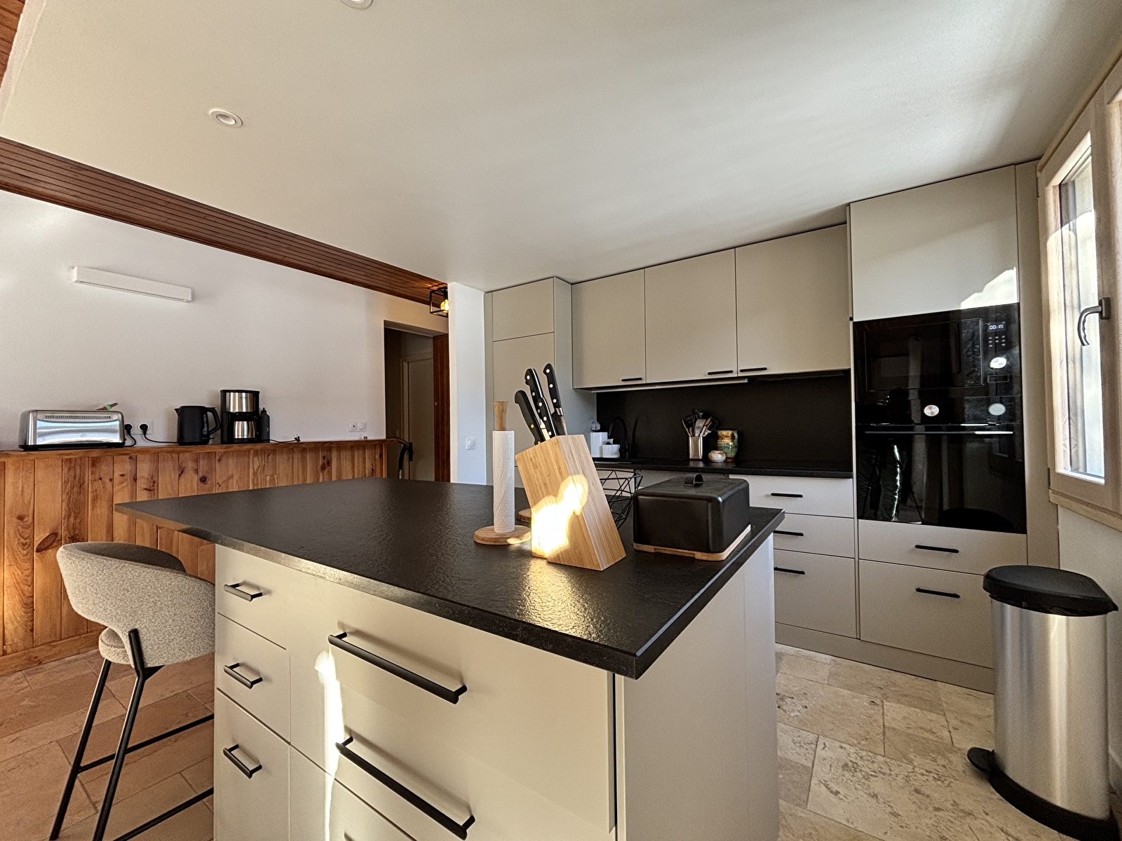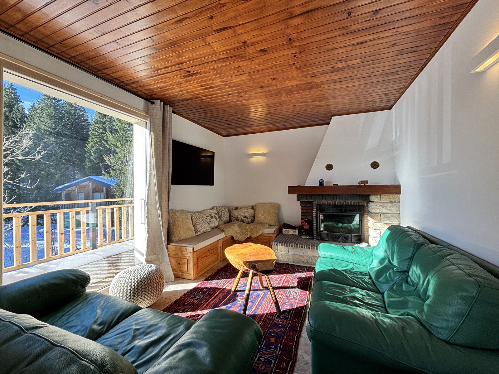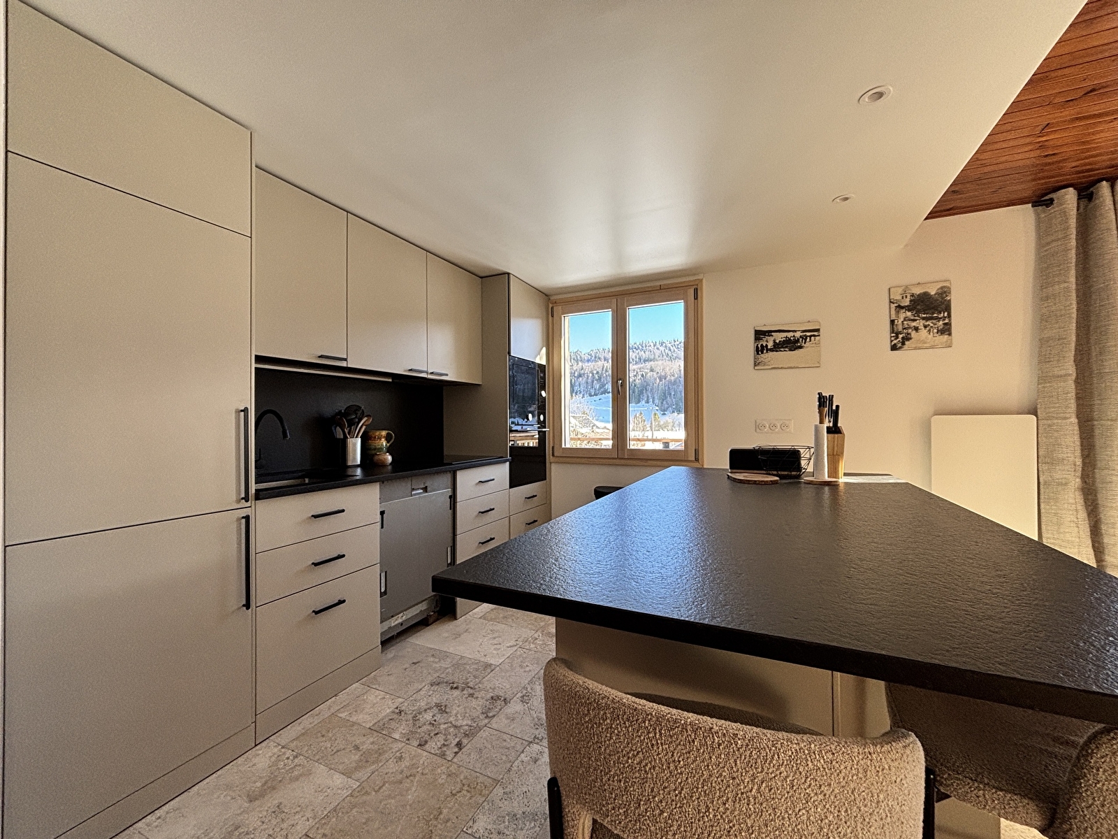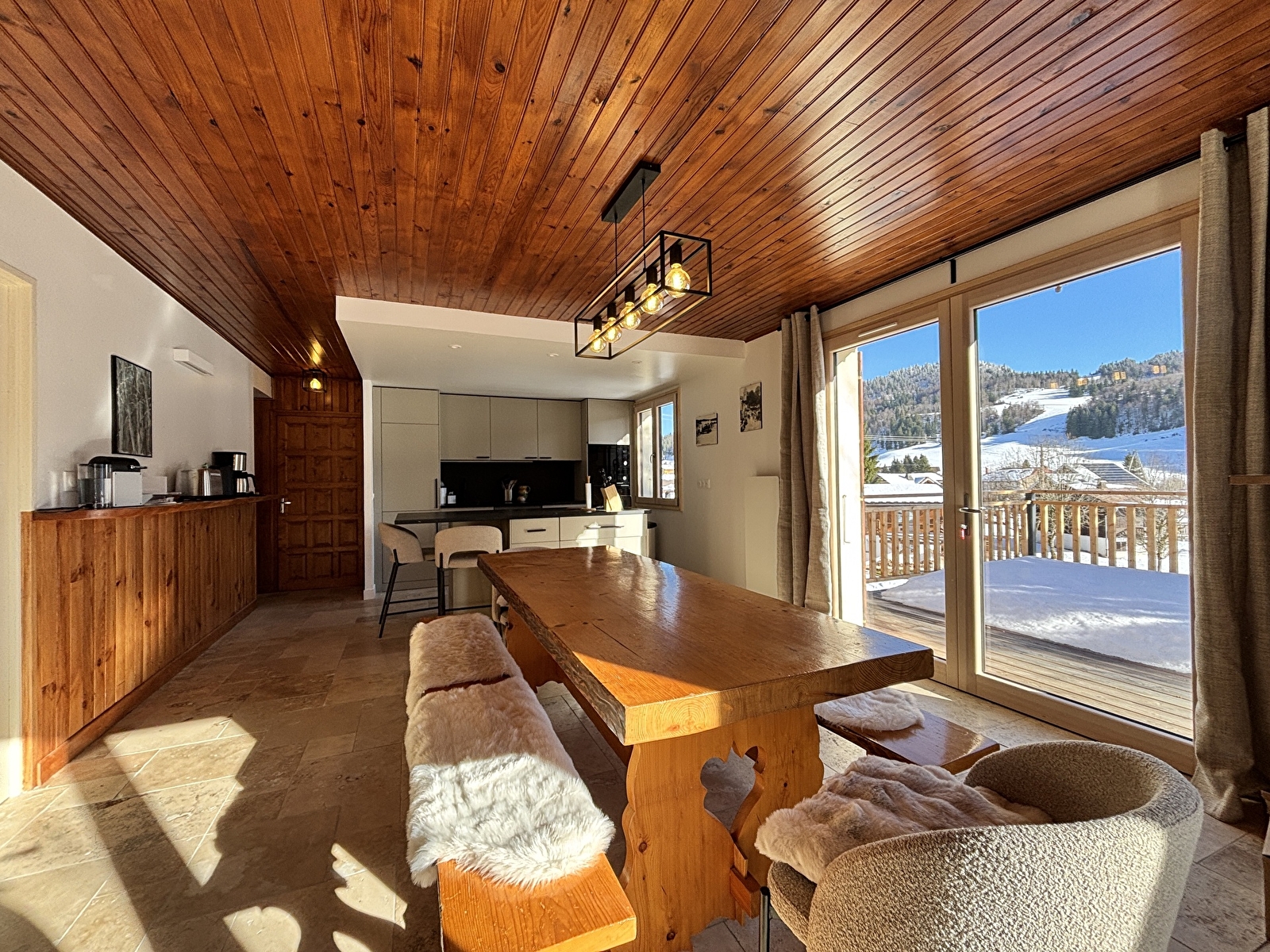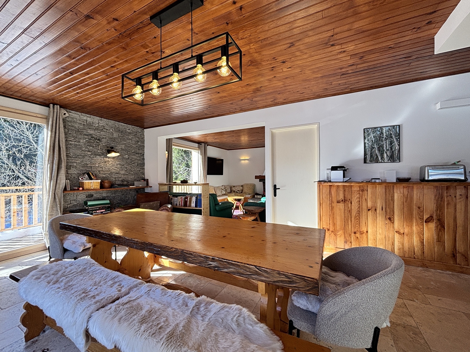 A l’étage, d’un grand séjour avec cuisine ouverte et coin salon avec cheminée.