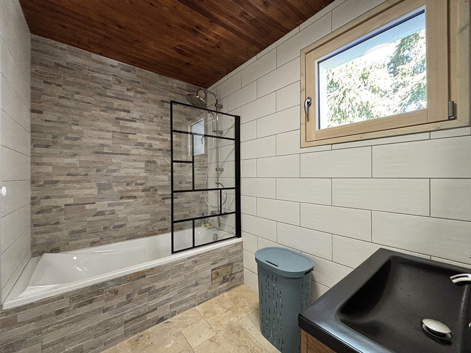Une chambre avec un lit en 140cm et une salle de bain avec baignoire et douche.