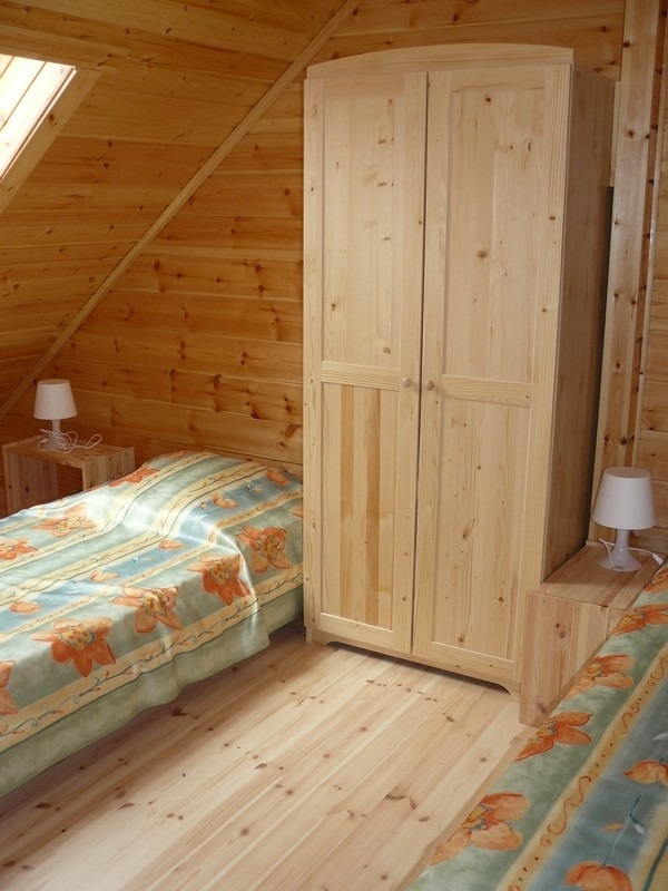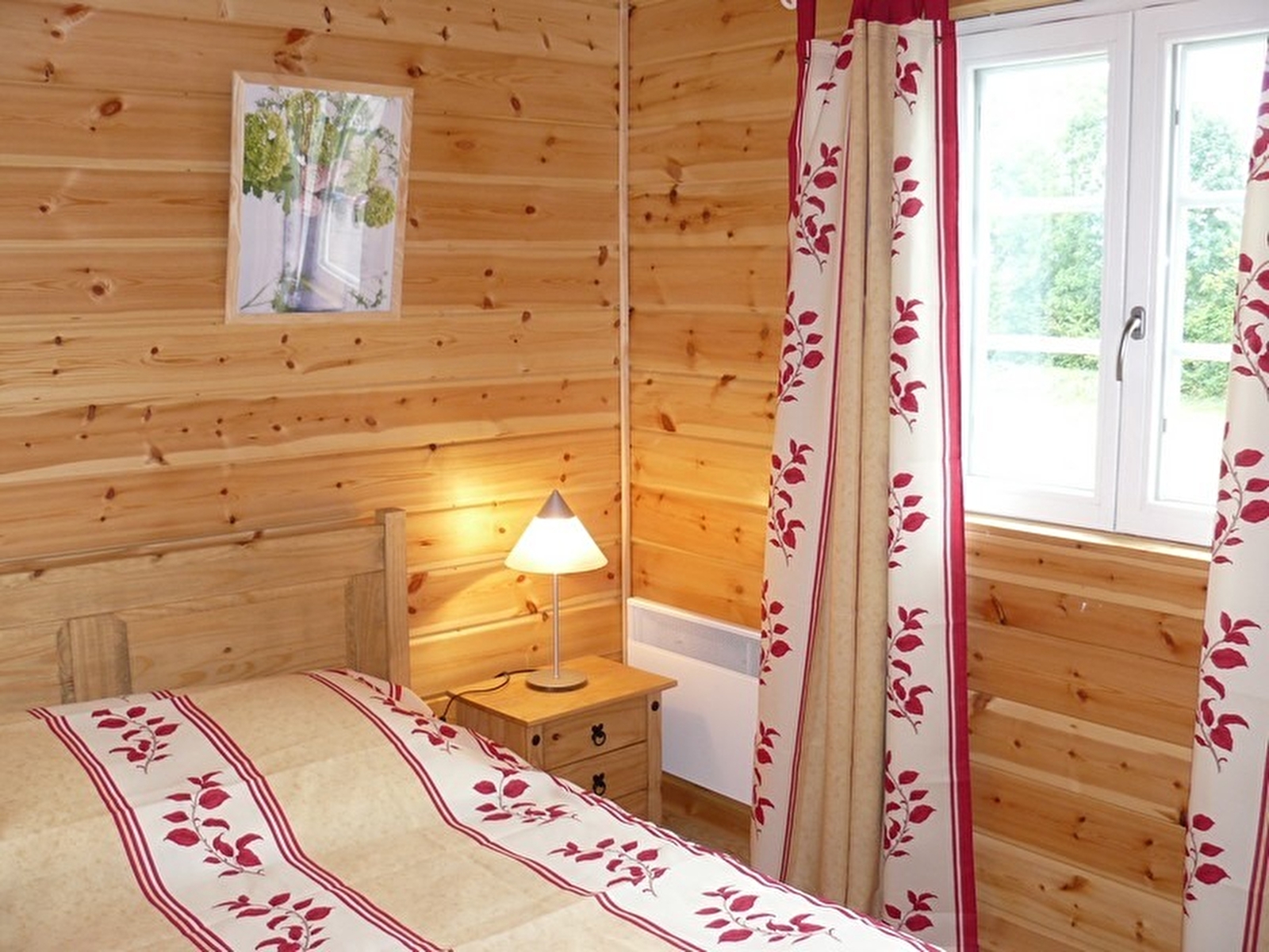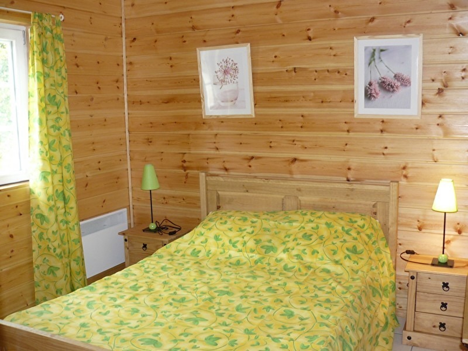 Dans un cadre naturel, chalet bois (MELEZE) entièrement neuf et indépendant, situé sur un terrain comportant 4 autres gîtes. Salon-séjour (poêle à bois) coin cuisine équipé (micro-ondes), salle d'eau (douche hydrothérapie et sauna finlandais), WC indépendant, ch1: 1 lit 2 pl, ch2: 1 lit 2 pl, à l'étage: ch3: 3 lits 1pl, ch4: 3 lits 1 pl, salle d'eau, wc. Chauffage électrique et poêle à bois (bois fourni gratuitement). Terrain attenant non clos,salon de jardin, barbecue. Piscine,tennis et terrain de jeux municipal à 100 mètres. Tous commerces à 800 m.