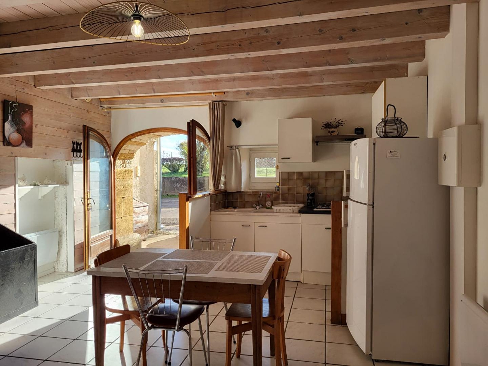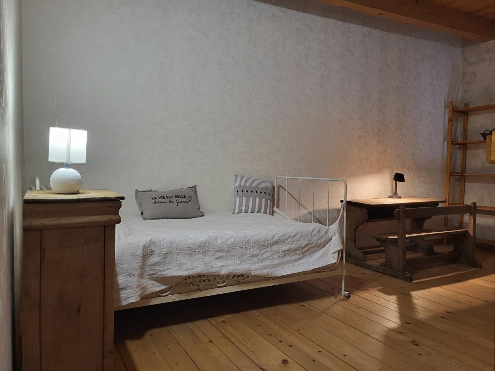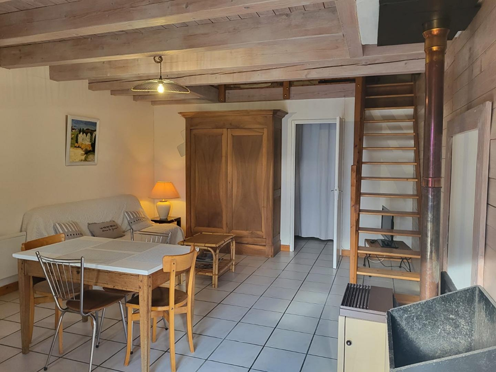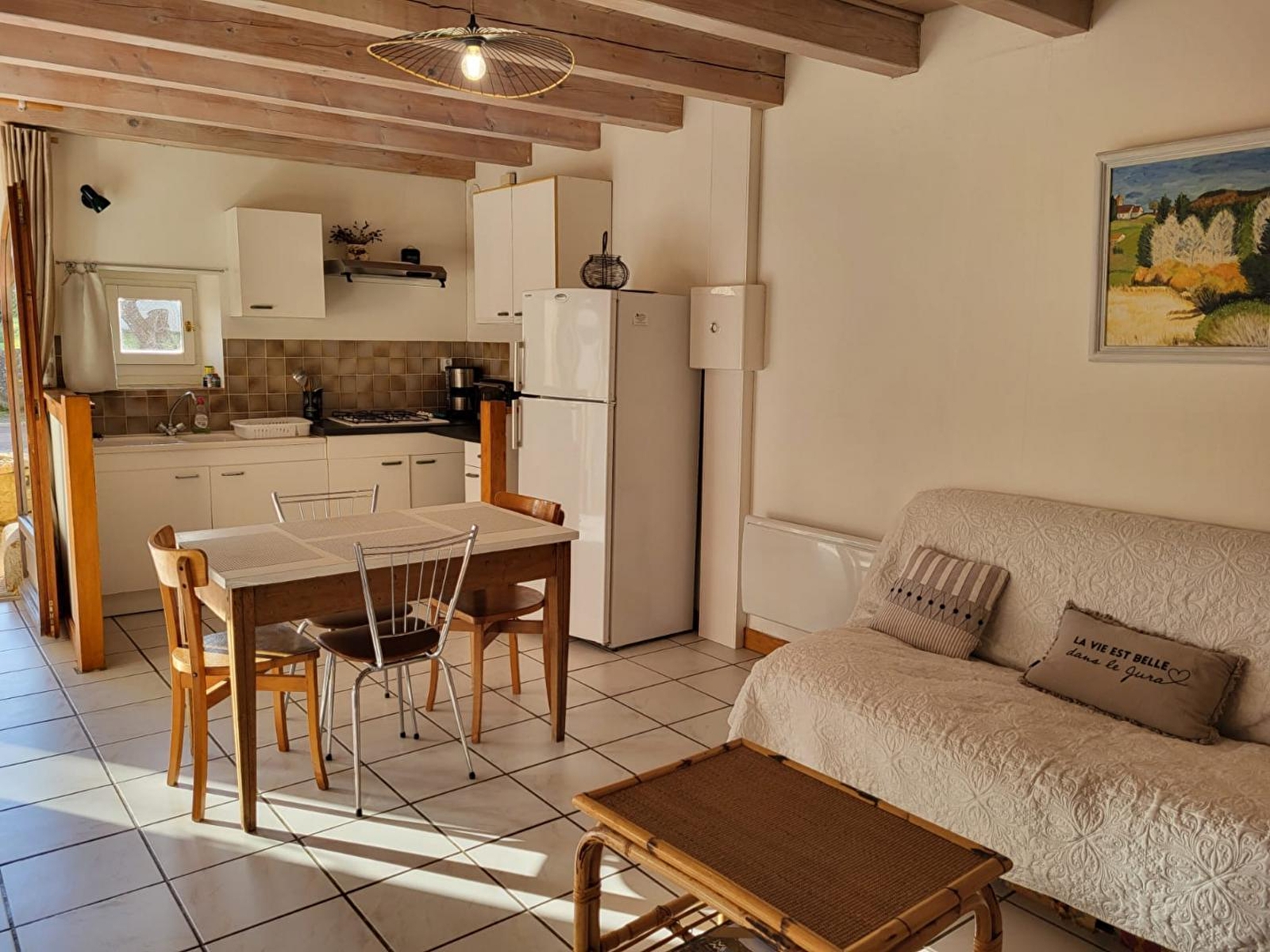 Au cœur du Haut- Jura, à seulement 3km du village médiéval de Nozeroy, et idéalement situé à proximité des Lacs, des cascades et des montagnes, venez séjourner dans cet appartement mitoyen à la maison des propriétaires. Au RDC : pièce de vie avec coin cuisine équipée, salon avec TV et poêle à bois (fourni gratuitement), salle d'eau avec douche et WC indépendant. A l'étage mezzanine avec 1 lit simple et 1 chambre (accessible en traversant la mezzanine) avec 1 lit double (140*190). Côté extérieur, vous pourrez profiter d'une petite terrasse avec salon de jardin et plancha.