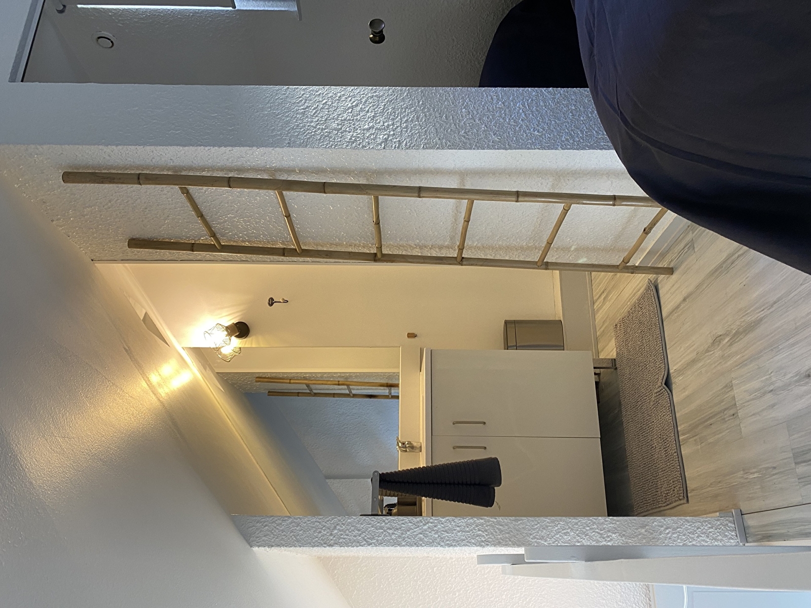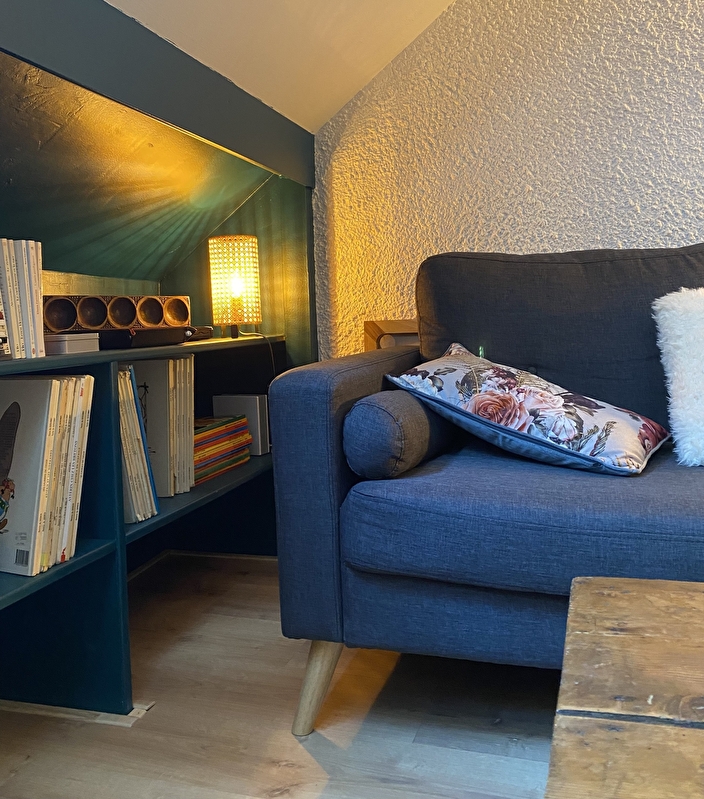 En mezzanine se trouve une chambre et sa salle de bain attenante.