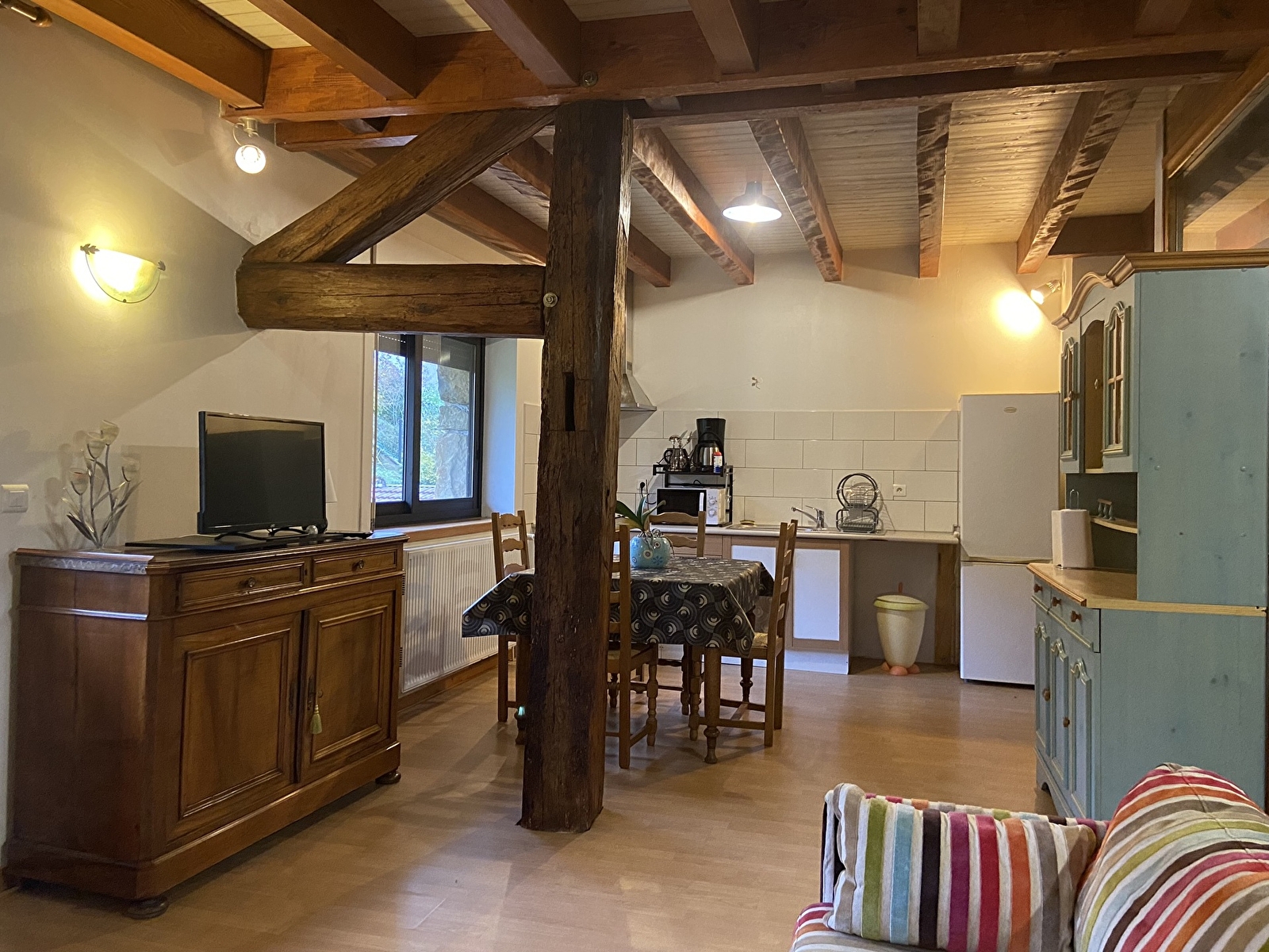 L'appartement "Entre Lacs et Sapins", qui est situé au calme sur les hauteurs de Dortan, offre une vue magnifique sur la montagne voisine. Une grande pièce de 65 m² se compose d'un salon, d'une cuisine entièrement équipée, d'un coin chambre. Une salle de bains à double lavabo ainsi que de toilettes séparées. La propriété peut accueillir jusqu'à quatre personnes (5 au grand maximum). Les installations supplémentaires comprennent le Wi-Fi avec un espace de travail dédié au télétravail, une télévision avec des livres et des jeux pour petits et grands.