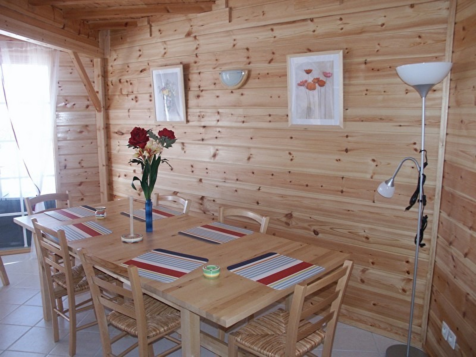 Dans un cadre naturel, chalet bois (ERABLE) entièrement neuf et indépendant, situé sur un terrain comportant 4 autres gîtes. Cuisine intégrée toute équipée (micro-ondes), salon-séjour (poêle à bois) avec de grandes baies vitrées ouvrant sur la terrasse, salle d'eau (douche italienne et sauna finlandais pour 4 pers), ch1 1 lit 2 pl, buanderie (sèche linge). A l'étage: salon en mezzanine (canapé-lit 2 pl), ch2:1 lit 2 pl + 2lits 1 pl superposés. chauffage électrique et poele à bois. Terrain attenant non clos, salon de jardin, barbecue, option ménage à 60E. Piscine, tennis et terrain de jeux municipal à 100m.