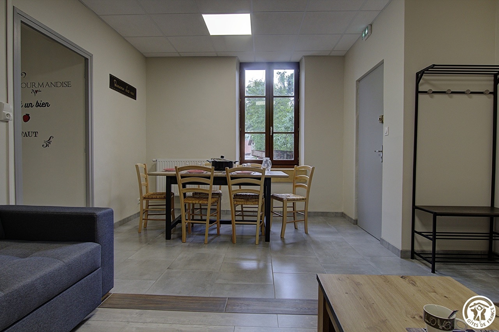 Il est situé dans un bâtiment communal en bordure du village comportant également 1 logement à l'année. Cet hébergement comprend une cuisine équipée, une salle à manger, un séjour avec cheminée, 5 chambres de 2 à 4 lits, 4 douches, 3 WC ; vous avez également une petite cuisine, un second séjour salon,. Deux autres chambres sont accessibles : une chambre de 3 personnes et une chambre de 2 personnes, une salle d'eau et un WC indépendant. Un accès par l'extérieur pour se rendre dans le petit gîte de 5 personnes. Un espace extérieur est mis à la disposition des hôtes avec une table de jardin. Pour un court ou un long séjour, vous pouvez vous réunir à 20 personnes, avec tout le nécessaire. Chauffage central. Mini-golf et étang de pêche sur place, rivière 7 km. Aire d'envol parapente. Restaurant 300m. Prix groupe (à la nuit) : forfait dégressif selon durée du séjour.