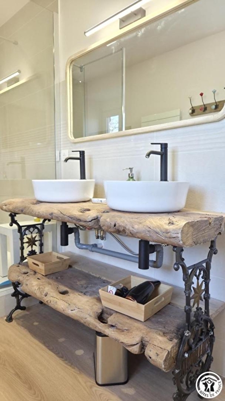 À l’intérieur, les pièces de vie dévoilent toute l’âme des lieux. Entre pierres apparentes, bois chaleureux et cuisine équipée ouverte sur le séjour, l’ambiance est conviviale et lumineuse. Dans l’un des gîtes, un imposant pressoir ancien témoigne du passé agricole de la maison. Simplicité, authenticité et fonctionnalité s’entremêlent pour créer un espace agréable.