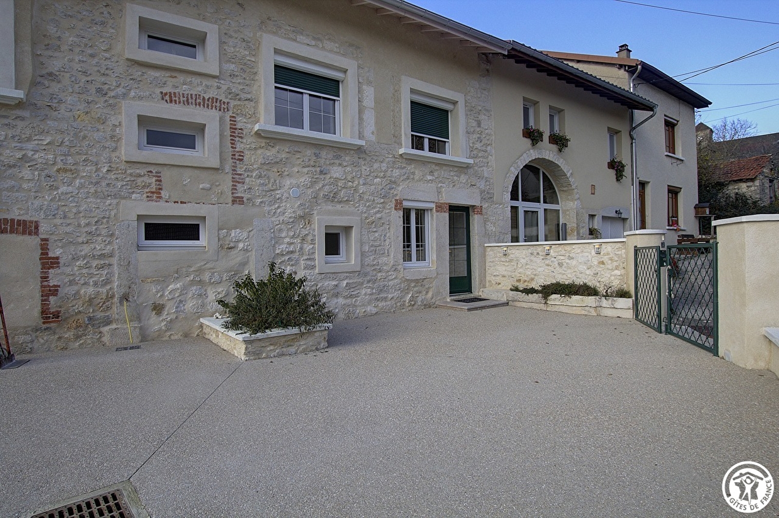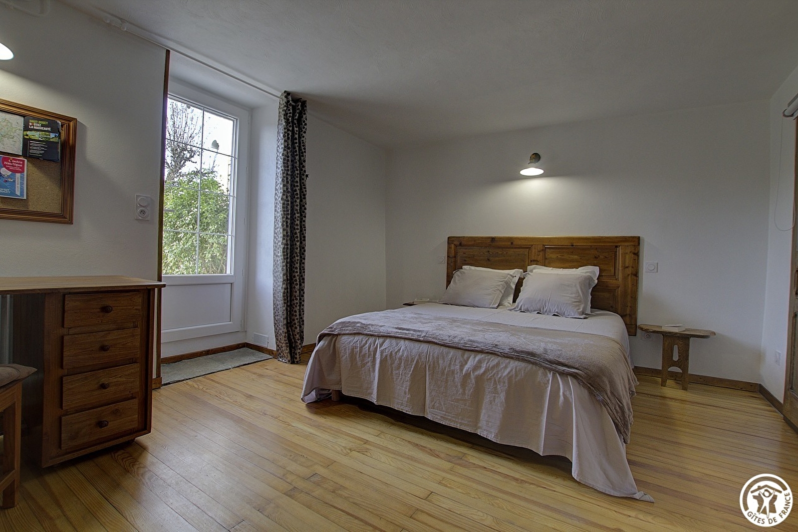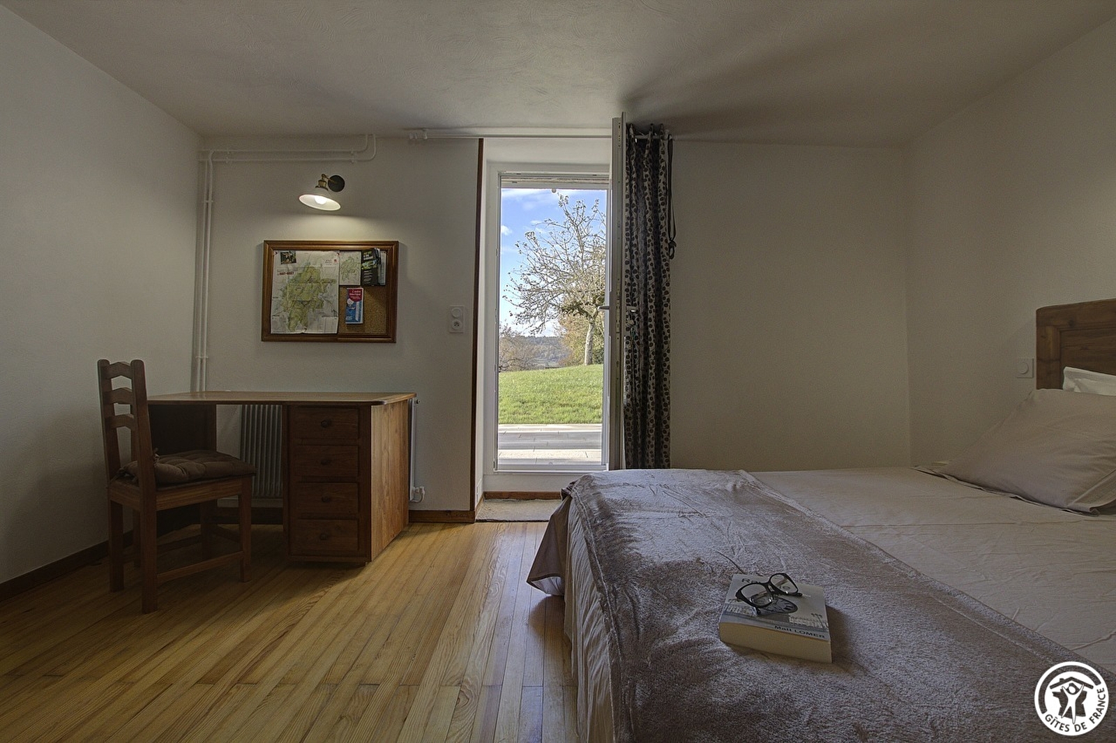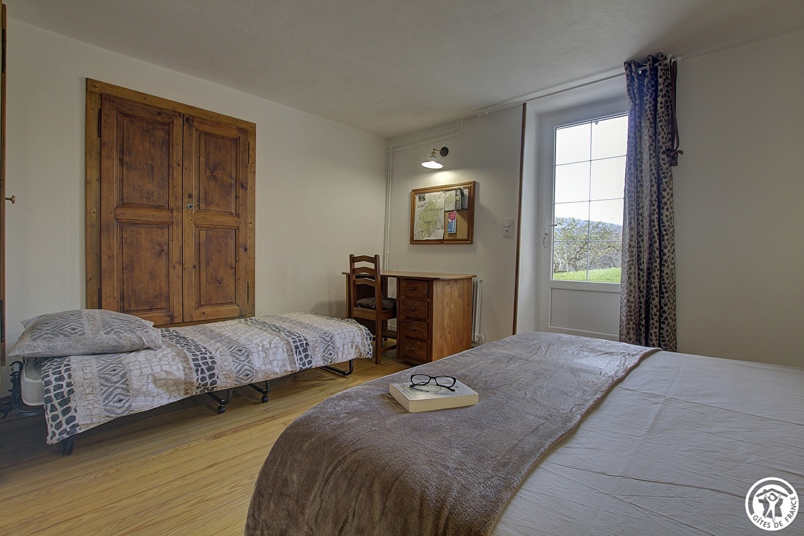 L'entrée se fait depuis la cour d'en haut sécurisée, puis sur le séjour et sa cuisine équipée et ouverte sur un salon où on peut se prélasser devant la cheminée. La chambre avec parquet, équipée d'un bureau en teck, comprend un lit en 160*200 plus un lit pliant couchage régulier en 90*190, donne accès directement sur la terrasse en dalle de pierre avec une vue dégagée sur le verger ; une salle d'eau et son WC. Un second gîte pour 5 personnes est mitoyen pour faciliter les retrouvailles en famille ou entre amis et profiter pleinement du grand verger mis à la disposition des hôtes. La propriété domine une vallée verdoyante où serpente le ruisseau l'Anconnans et la rivière l'Oignin. Les plus du gîte Chez le Tourneur : les lits sont faits à l'arrivée, le linge de toilette fourni et les charges incluses.