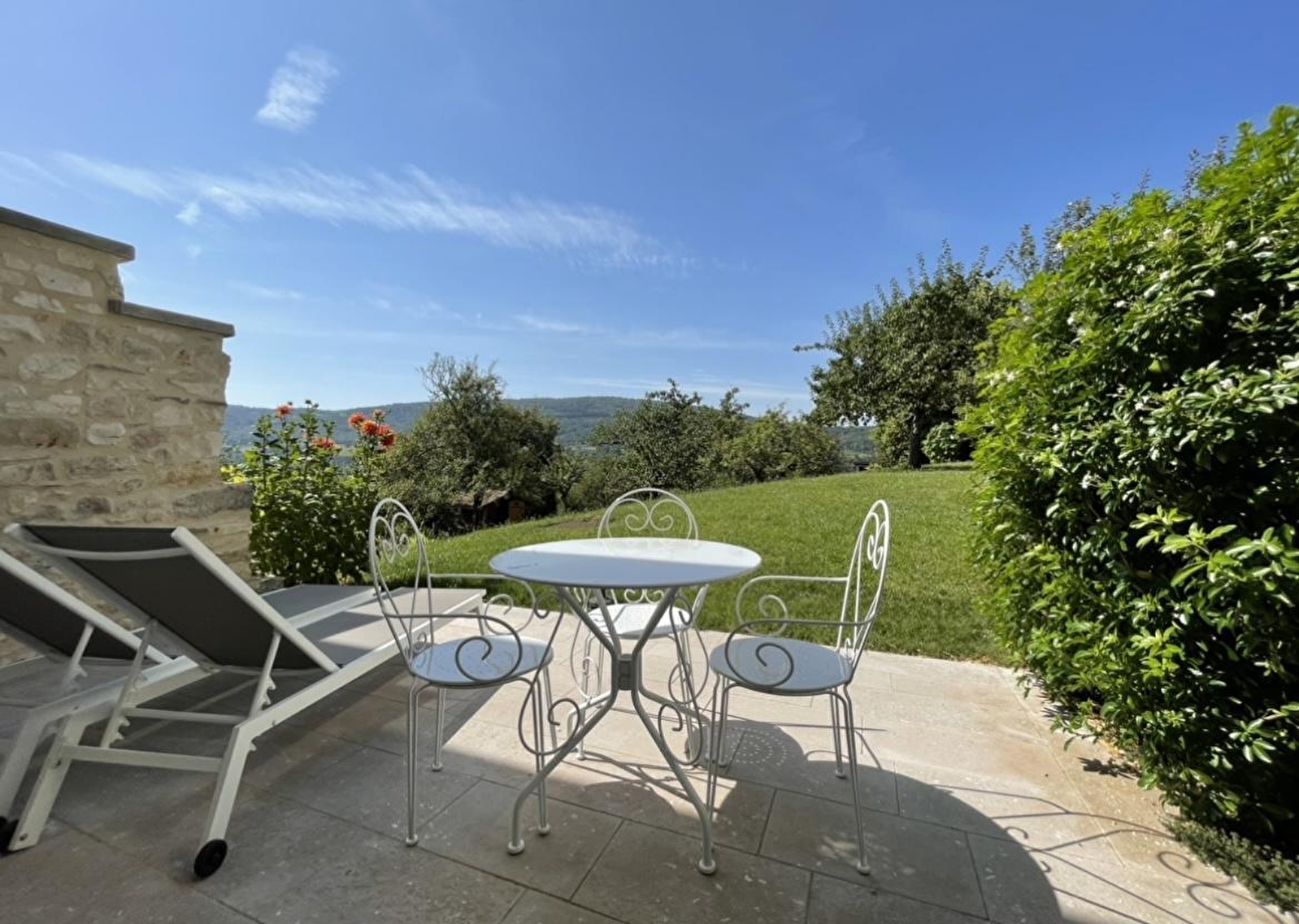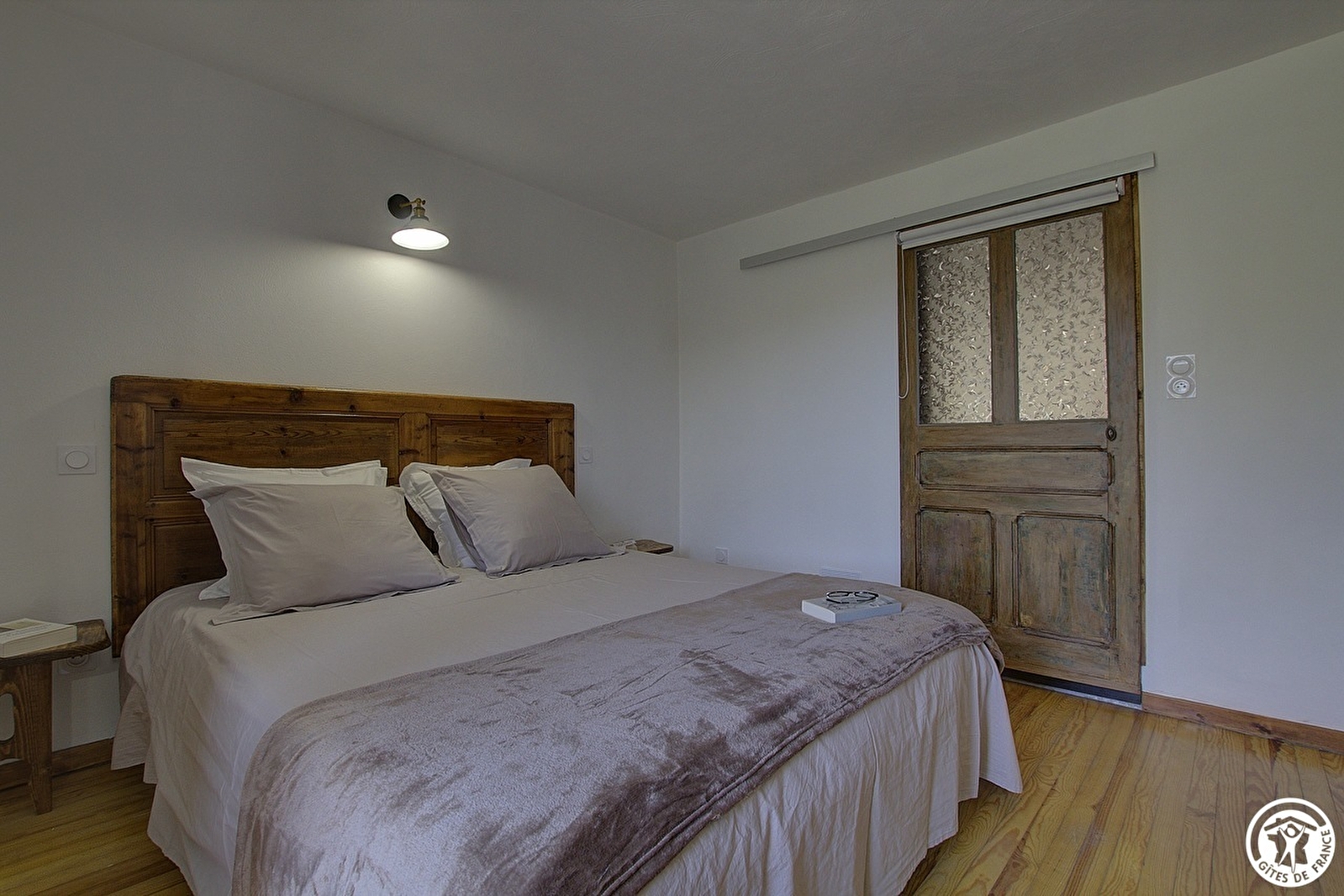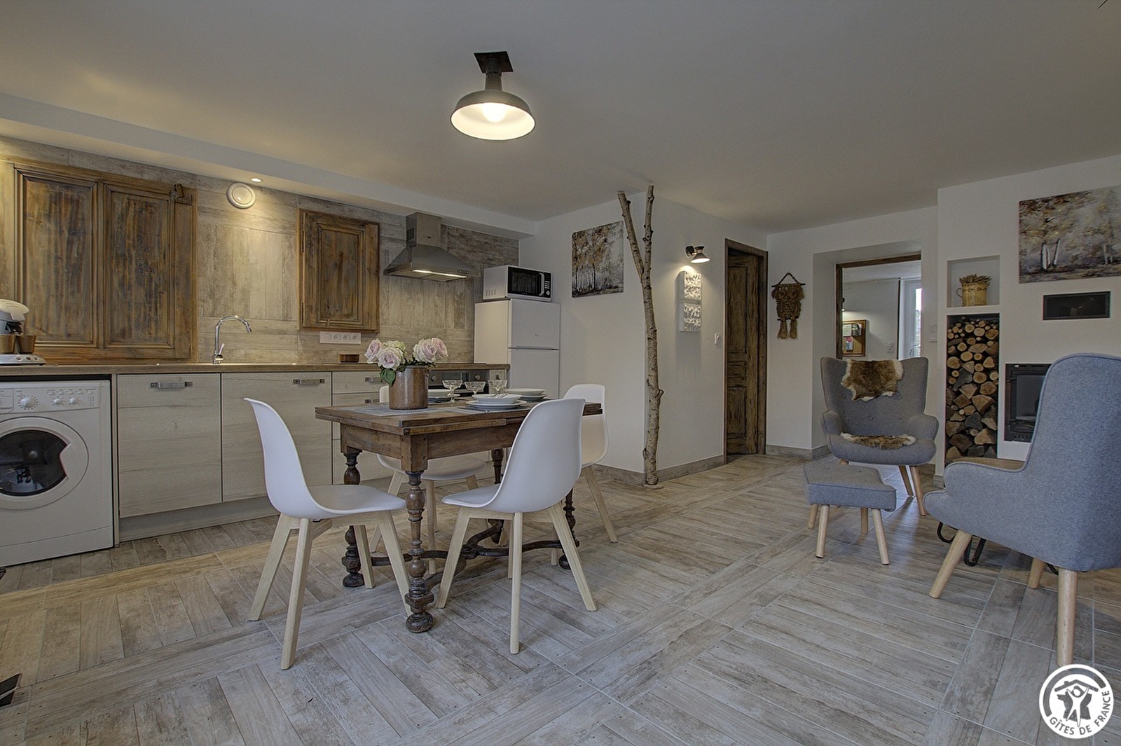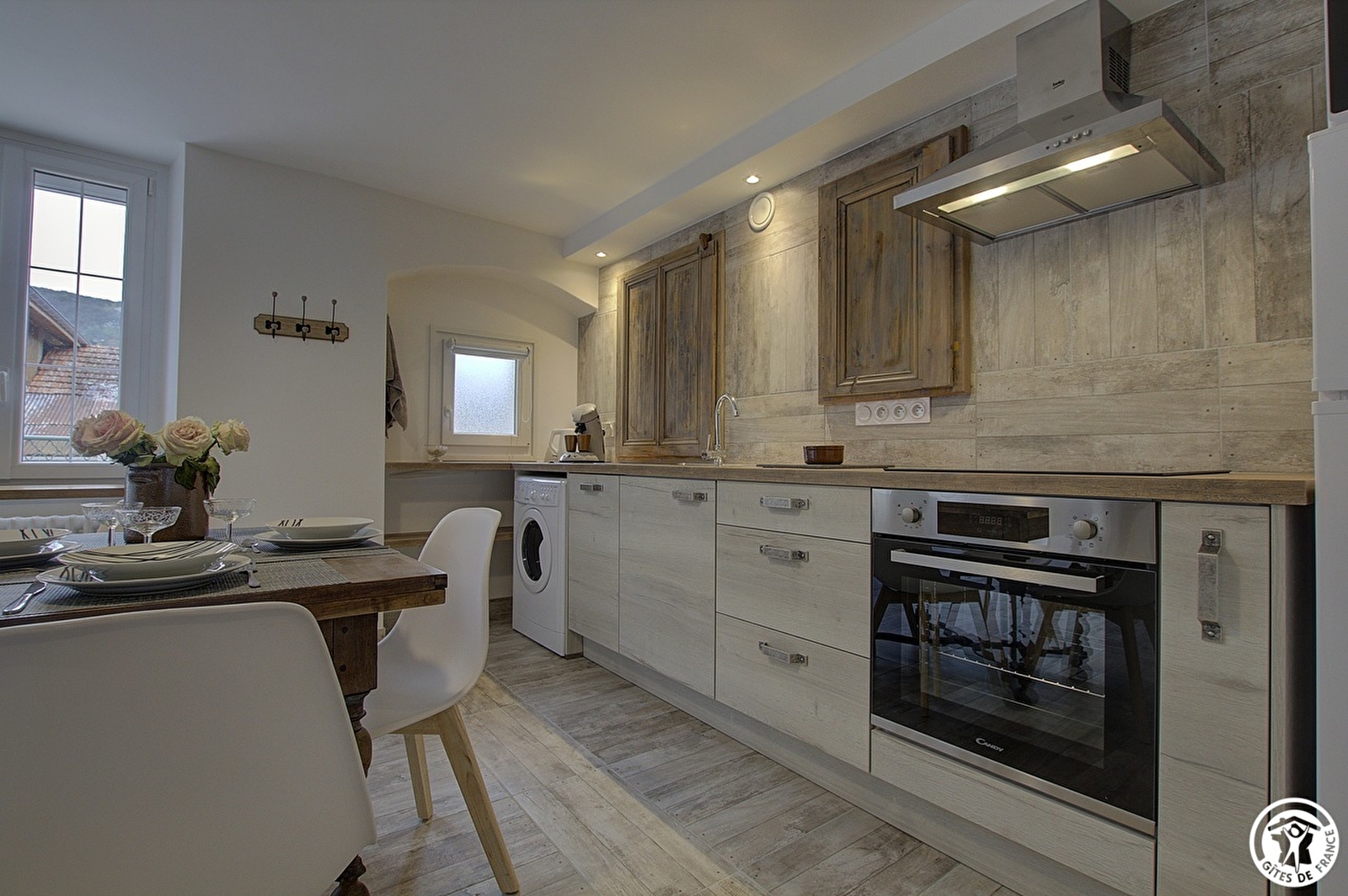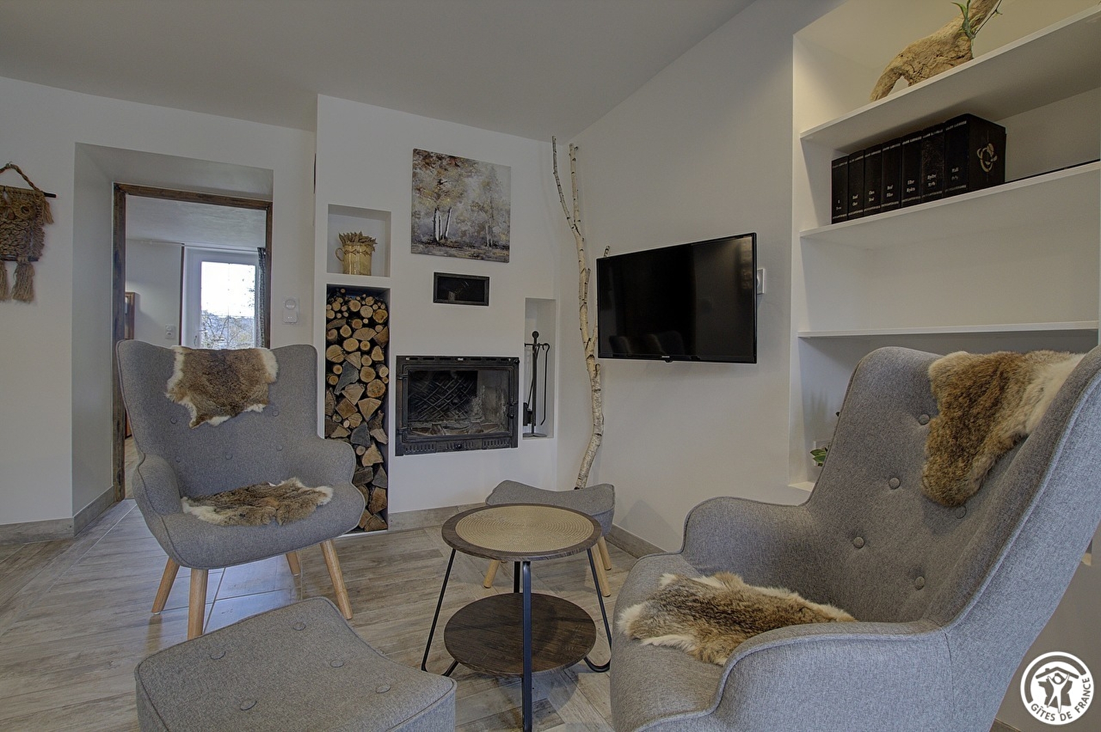L'entrée se fait depuis la cour d'en haut sécurisée, puis sur le séjour et sa cuisine équipée et ouverte sur un salon où on peut se prélasser devant la cheminée. La chambre avec parquet, équipée d'un bureau en teck, comprend un lit en 160*200 plus un lit pliant couchage régulier en 90*190, donne accès directement sur la terrasse en dalle de pierre avec une vue dégagée sur le verger ; une salle d'eau et son WC. Un second gîte pour 5 personnes est mitoyen pour faciliter les retrouvailles en famille ou entre amis et profiter pleinement du grand verger mis à la disposition des hôtes. La propriété domine une vallée verdoyante où serpente le ruisseau l'Anconnans et la rivière l'Oignin. Les plus du gîte Chez le Tourneur : les lits sont faits à l'arrivée, le linge de toilette fourni et les charges incluses.