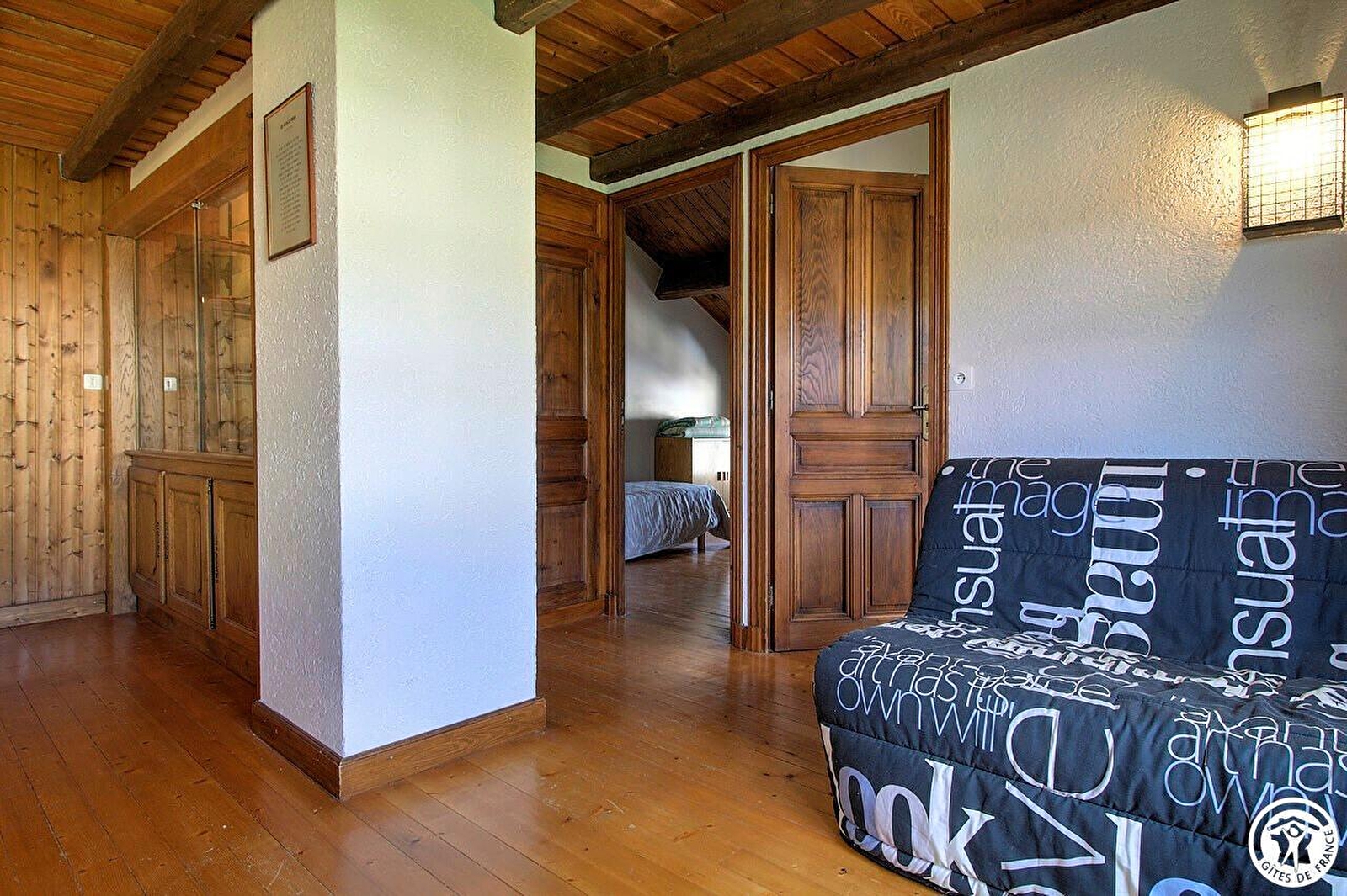 R.d.c.: hall d'entrée, garage. 1er étage : belle pièce de vie lumineuse avec coin salon avec direct sur le balcon et le jardin, une grande cheminée ouverte, cuisine, salle d'eau. 2e étage : 2 chambres (2 lits 1 pers, 1 lit 2 pers, lit BB), mezzanine (bureau) avec un canapé lit pour 2 personnes. Chauffage central fuel compris. Espace extérieur privatif au gîte, salon de jardin. Barbecue. Gîte non fumeur. Plan d'eau, pêche, forêts sapins, VTT, sentiers balisés. Observatoire. Cascades. Parc aventure à 10 km. Forfait ménage et loc de draps possible.