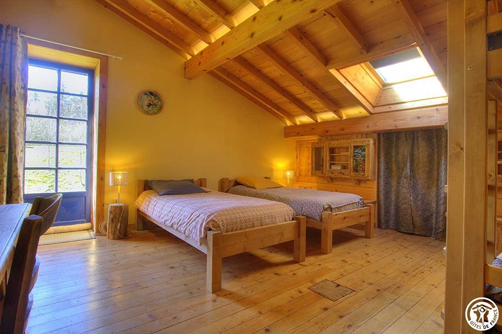 Au niveau de la grange : local pour le bois ainsi que pour vélos et skis. Entrée du gîte vers les chambres : 1 petite chambre double + une grande chambre pour 4 personnes avec dressing.