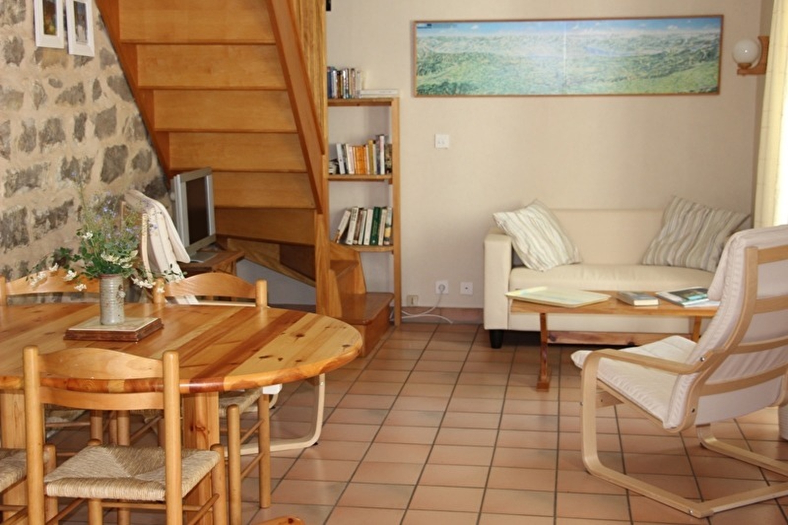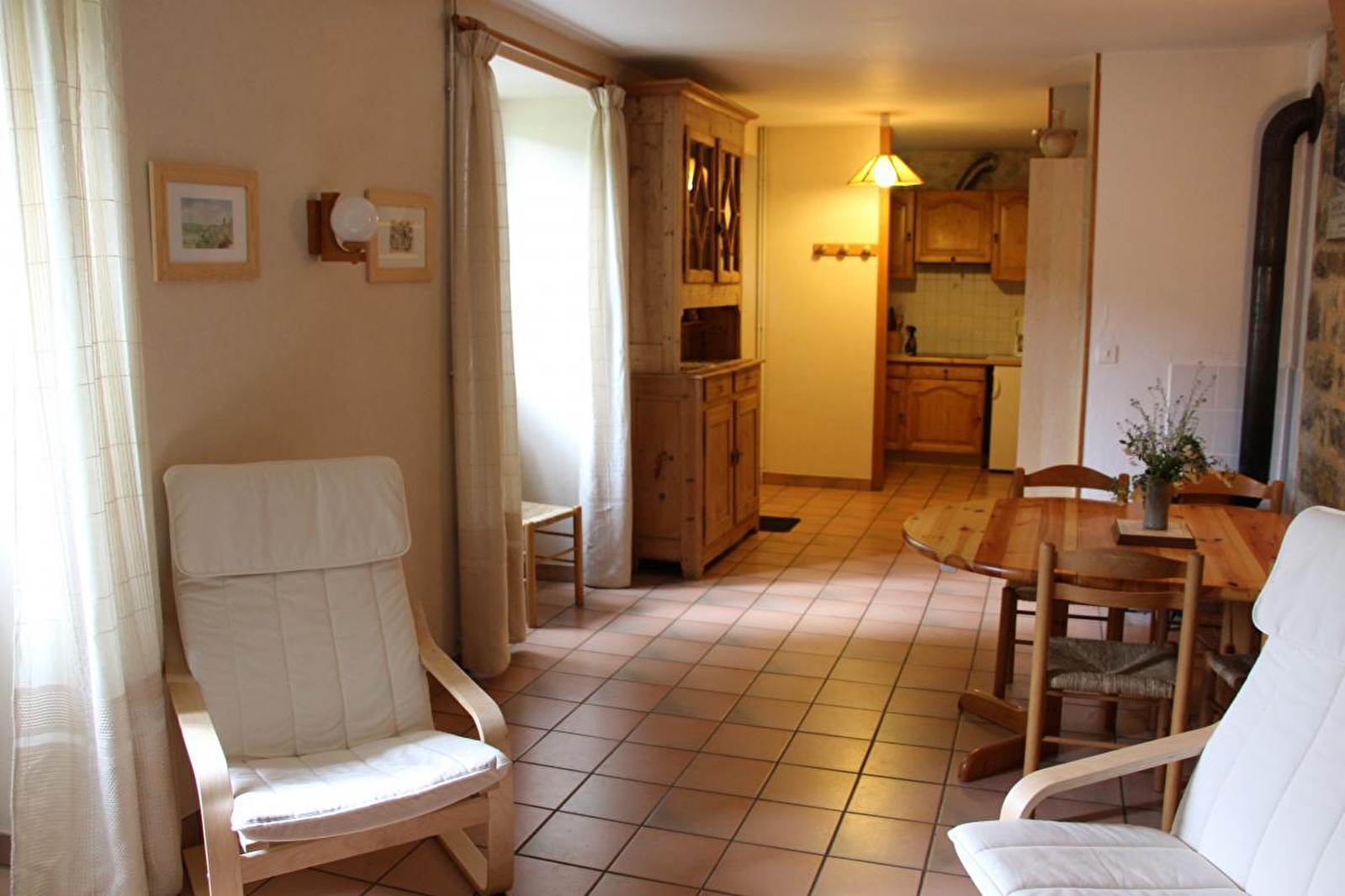 Maison mitoyenne avec accès indépendant. A l'étage avec au 1er: séjour-coin cuisine avec poêle à bois, salle d'eau, WC indépendant. Au 2ème étage: ch1: 1 lit 2 pl, ch2: 2 lits 1 pl. Jardin non clos, salon de jardin, barbecue. Chauffage central et bois (fourni gratuitement). Chaise bébé. Toutes charges comprises. Congélateur. A disposition: four, jeux, livres, local fermé au rez-de-chaussée pour ranger du matériel et des vélos.