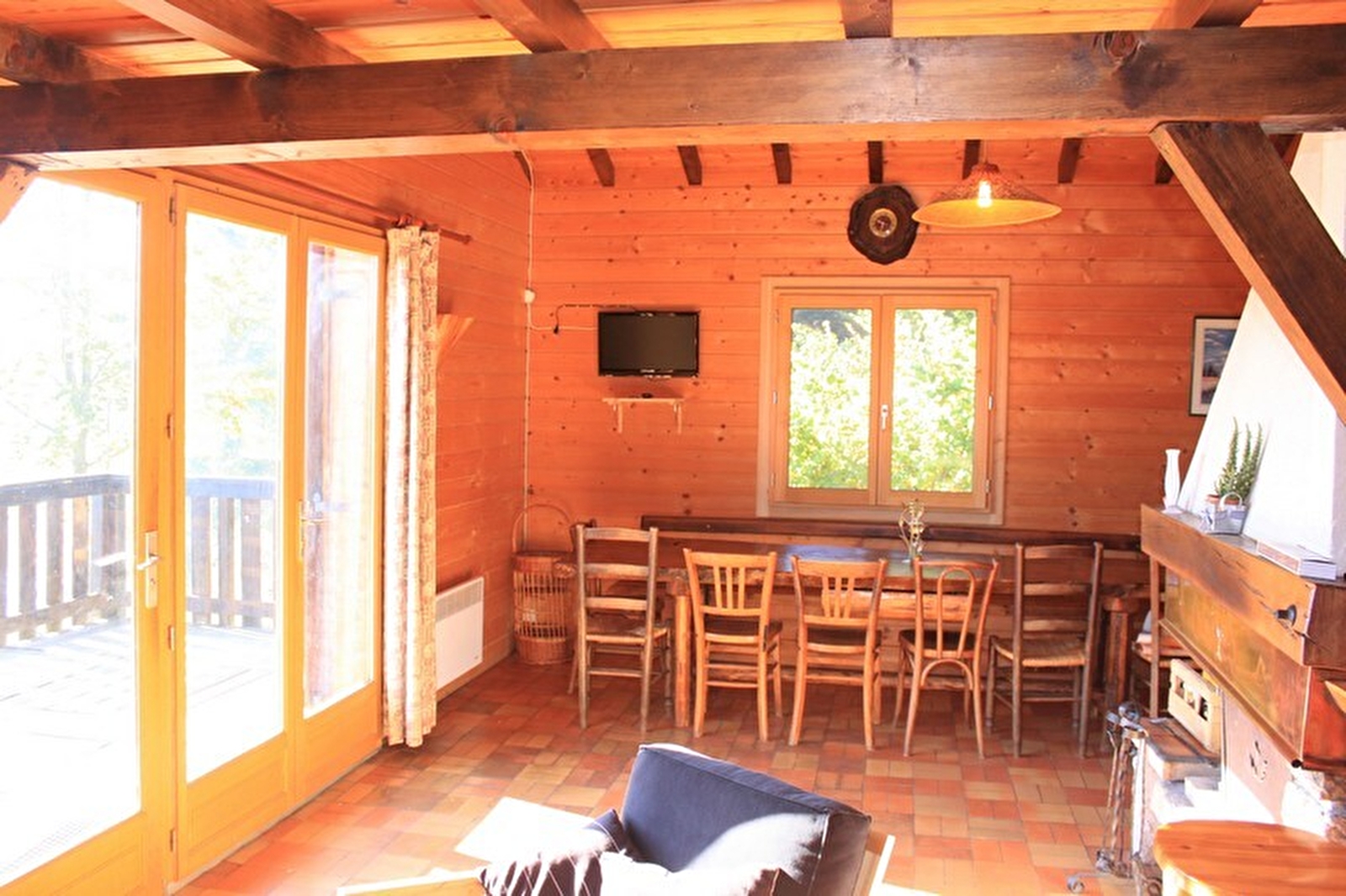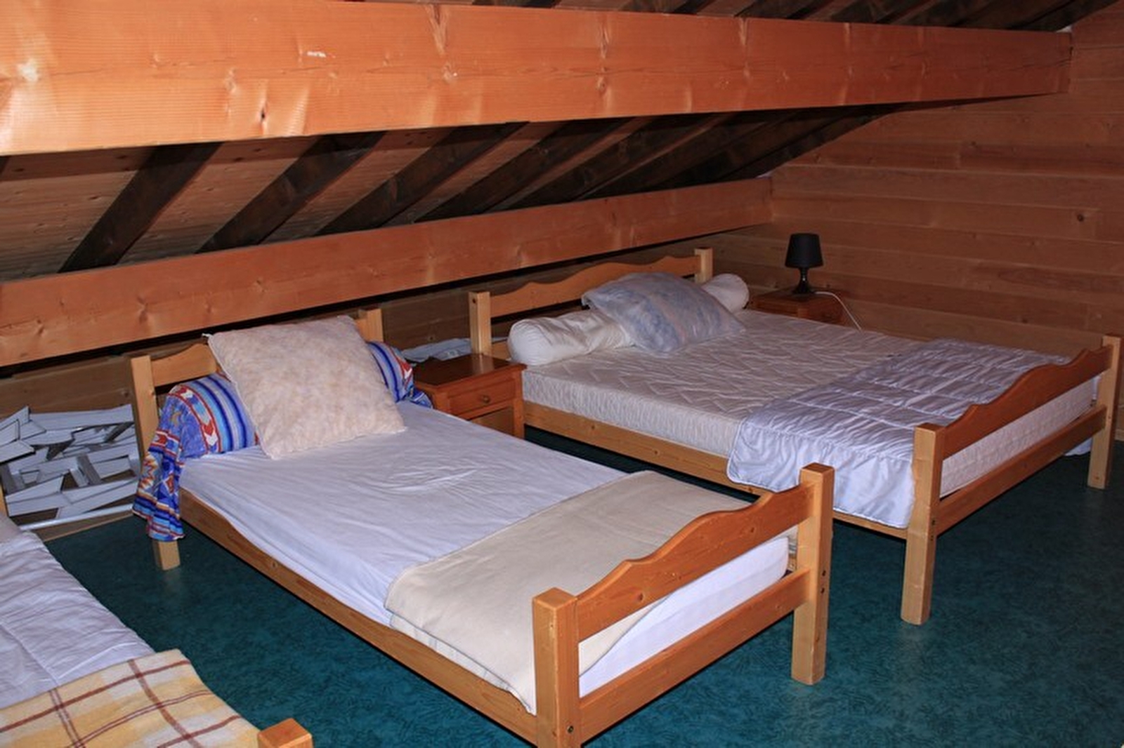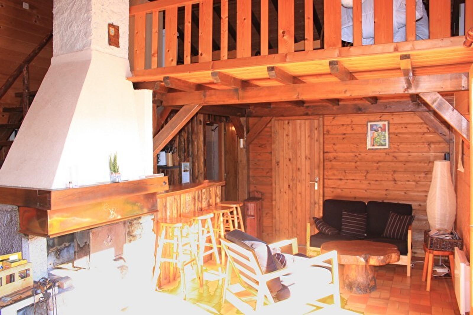 Chalet indépendant. Cuisine, séjour, salon. A l'étage: mezzanine 1 lit 2 pl, 2 lits 1 pl, salle d'eau, ch1: 1 lit 2 pl, terrain attenant non clos, salon de jardin, barbecue. Chauffage électrique. Charges non comprises. Possibilité d'accueillir une 5ème personne sur demande.