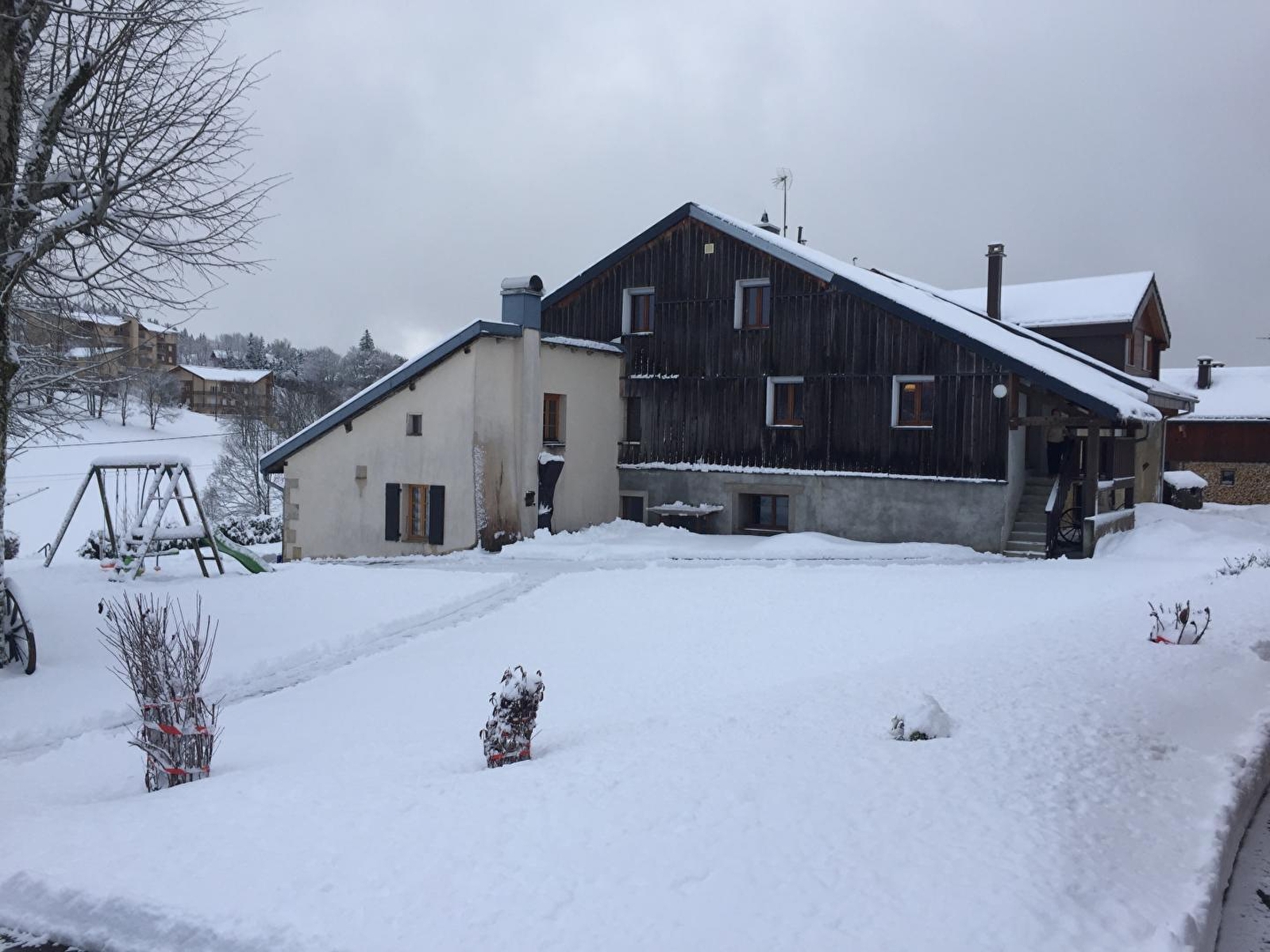 Logement à l'étage. Séjour, coin-cuisine, salon, canapé convertible, ch1: 1 lits 2 pl (160cm), ch2: 1 lit 2 pl et 2 lits 1 pl superposés, salle de bains, salle d'eau, terrain attenant non clos, salon de jardin, barbecue, parking privé déneigé. Chauffage électrique. Toutes charges comprises en été.
