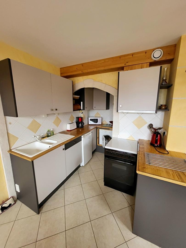 Appartement de plain-pied, mitoyen de la maison du propriétaire, avec entrée indépendante, entièrement neuf et décoré avec goût. Salon-séjour, canapé convertible 2 places, cuisine intégrée toute équipée. Ch1 : 1 lit 2 pl. Salle d'eau, WC séparé. Chauffage central au sol, aspiration centralisée. Terrain attenant non clos, parking privé, salon de jardin, barbecue, table de ping-pong disponible l'été. Local pour les skis et les vélos. Gîte situé à quelques minutes à pied des pistes de skis, et de tous les commerces. Toutes charges comprises. Accès Wifi. Parking privé.