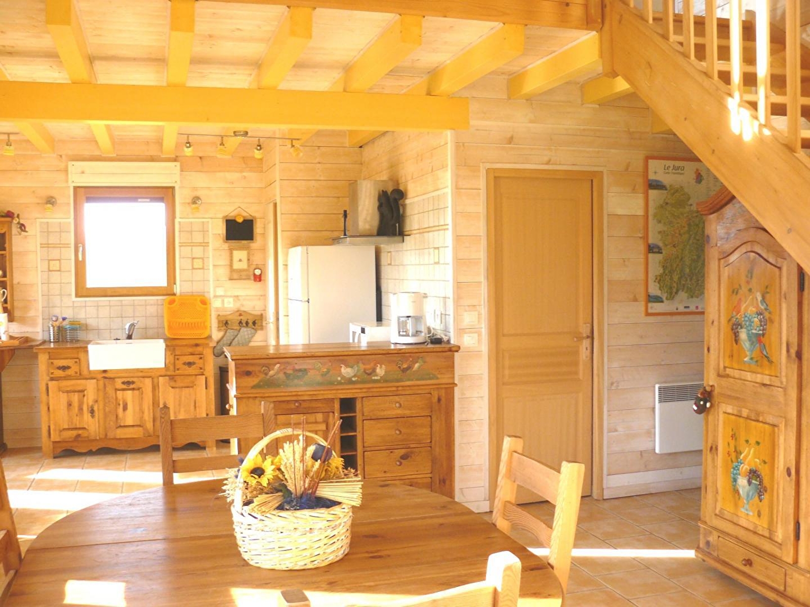 Chalet indépendant, en melèze, construit en 2008 et situé à 300m des plages du Lac de Chalain, dans un quartier très calme. Construction aux normes Haute Qualité Environnementale. Décor montagne, murs et poutres lasurés ou peints, meubles en bois aux décors peints. Grande pièce à vivre de 35 m², 2 chambres de 2 et 3 pers, mezzanine de 27 m² avec salon. Terrasse couverte, balcon, jardin de 1200m², salon de jardin, sauna, cheminée murale, écran plasma. Charges non comprises. Chauffage électrique. Prestation de massage/relaxation au chalet sur demande. Accès wifi Note : un forfait ménage obligatoire s’appliquera automatiquement au moment de la réservation.