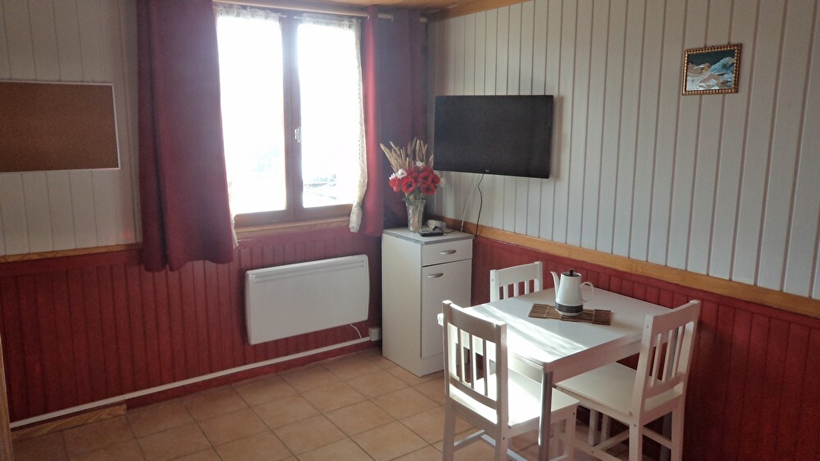 Au coeur du Haut Jura, à quelques pas de la station de ski des Marais, petit logement au rez de chaussée de la maison des propriétaires, dans laquelle se trouvent également d'autres logements. Entrée indépendante. Hall d'entrée, pièce à vivre composée d'un petit coin cuisine, et coin salon avec canapé et tv écran plat. Chambre avec 1 lit de 140cm (et un lit bébé) et salle d'eau avec douche et wc. Terrain attenant non clos, équipé de salon de jardin et barbecue pour la belle saison. Abri voiture, et terrain de pétanque à disposition. Linge de lit non fournit