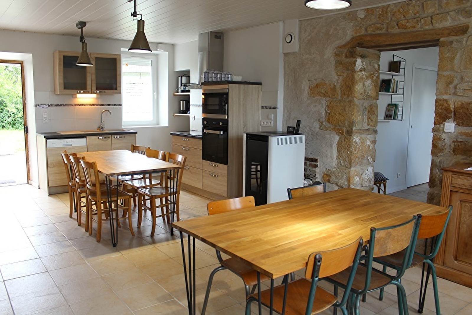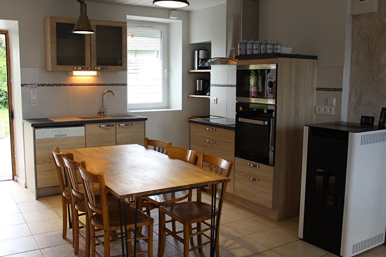 Idéalement située à 5 kilomètres de l'autoroute , cette charmante maison entièrement rénovée possède de nombreux atouts pour passer un agréable séjour en famille ou entre amis. En RDC, spacieuse cuisine toute équipée avec poêle à granulés (1er sac de pellets offert), coin salon avec TV, 1 chambre avec lit double et salle d'eau privative équipée d'une douche et d'un WC, coin buanderie avec lave-linge et sèche-linge, WC indépendant. A l'étage, 2 chambres avec chacune un lit double, dont une avec une salle de bain privative avec baignoire et WC, une chambre avec 2 lits superposés, une salle d'eau et un WC indépendant. Une autre pièce pouvant faire office de studio avec une kitchenette et un canapé convertible et qui offre un accès direct sur l'extérieur. Pour votre plus grand confort, les draps sont fournis. Coté extérieur, un vaste terrain aménagé avec salon de jardin, plancha, chiliennes, vous permettra de profiter de la quiétude des lieux. Un garage fermé est également mis à disposition pour les motos (avec possibilité de petit bricolage) et les vélos. La base nautique de Desnes se trouve à moins de 5 minutes du gîte : plage surveillée, pédalos, jeux d'eau gonflable, petits et grands passeront d'agréables moments !